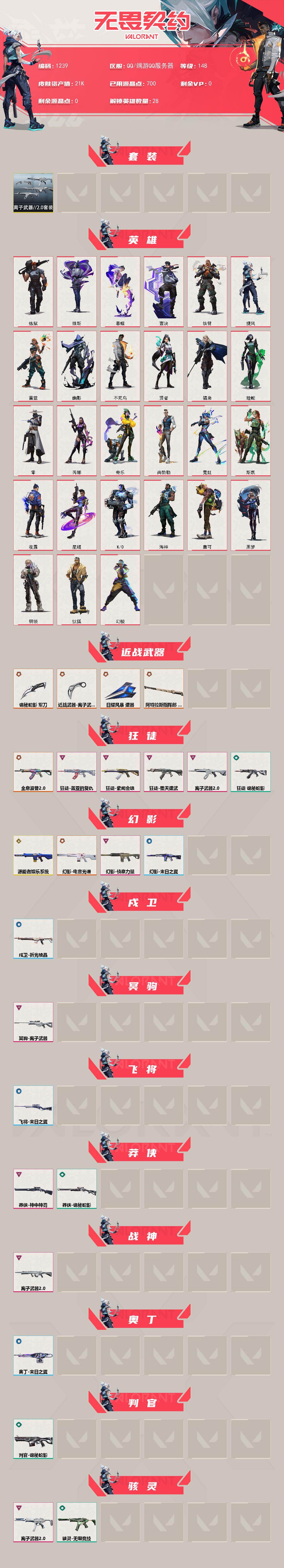 [16212167]【套装】:离子武器//2.0套装 【英雄】:幻棱,炼狱,维斯,暮蝶,钛狐,壹决,铁臂,捷风,雷兹,幽影,不死鸟,贤者,猎枭,蝰蛇,零,芮娜,奇乐,尚勃勒,霓虹,斯凯,夜露,星礈,K/O,海神,盖可,黑梦,钢锁 【近战武器】:近战武器-离子武器//2.0 爪刀,近战武器-诡秘蛇影 军刀,近战武器-日耀风暴 遗器,近战武器-阿特拉斯指挥部 甩棍 【狂徒】:狂徒-全息波普//2.0,狂徒-堕天遗武,狂徒-盖亚的复仇,狂徒-紫阙金琅,狂徒-离子武器//2.0,狂徒-诡秘蛇影 【幻影】:幻影-源能者娱乐系统,幻影-电音光谱,幻影-侦察力量,幻影-末日之翼,幻影-电音光谱 【戍卫】:戍卫-折光棱晶 【冥驹】:冥驹-离子武器 【飞将】:飞将-末日之翼 【莽侠】:莽侠-神中神罚,莽侠-诡秘蛇影 【战神】:战神-离子武器//2.0 【奥丁】:奥丁-末日之翼 【判官】:判官-诡秘蛇影 【骇灵】:骇灵-离子武器//2.0,骇灵-无限竞技 【蜂刺】:蜂刺-折光棱晶 【标配】:标配-折光棱晶 【鬼魅】:鬼魅-诡秘蛇影 【狂怒】:狂怒-离子武器//2.0 【短炮】:短炮-末日之翼 【卡面】:无畏契约:暮蝶 卡面,热舞环节 卡面,失而复得 卡面,无畏契约GO!第一卷:芮娜 卡面,无畏契约GO!第一卷:零 卡面,《双城之战》金克丝 卡面,黑影先生的咖啡! 卡面,代号红色 卡面,新兵报到 卡面,V契约 卡面,无畏契约 卡面 【喷漆】:伤心心 喷漆,买装还是存钱 喷漆,无畏契约GO!第一卷:贤者 喷漆,胜利属于无畏契约 喷漆,GLHF 喷漆,无畏契约 喷漆 【挂饰】:无畏契约GO!第一卷 芮娜 挂饰,无畏契约GO!第一卷 零 挂饰,传世莲华 挂饰,天外飞客 挂饰,红鳞松叶 挂饰,《双城之战》魄罗 挂饰,无畏契约 纪念币 挂饰