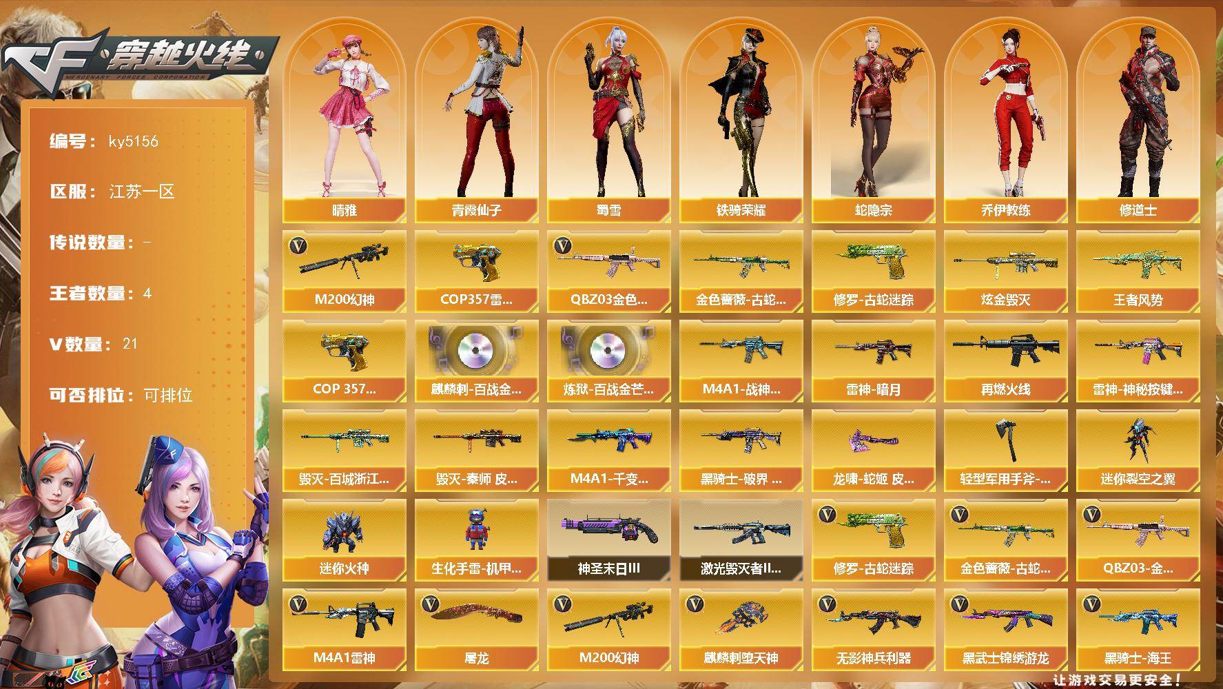 [16212735]江苏一区-21V-4王者-1炫金 【热门武器】:QBZ03-金色蔷薇,M200-幻神,金色蔷薇-古蛇迷踪,修罗-古蛇迷踪,COP 357-雷霆王者 【王者炫金武器】:王者风势,COP 357-雷霆王者,炫金毁灭 【音效卡】:麒麟刺-百战金芒-盛典舞曲音效卡,炼狱-百战金芒-庆典舞曲音效卡 【皮肤】:雷神-暗月,M4A1-战神赵云,M4A1-再燃火线,雷神-神秘按键 皮肤,毁灭-百城浙江 皮肤,毁灭-秦师 皮肤,M4A1-千变-孔明皮肤,黑骑士-破界 皮肤,龙啸-蛇姬 皮肤,轻型军用手斧-再燃火线 【角色】:晴雅,蛇隐宗,乔伊教练,修道士,暗夜-X,北极狐-X,初恋灵狐,电竞少女,芳心审判者,飞虎队-X,风暴女,嘉年华灵狐,娟娟,兰-海滩派对,0号玩家,灵狐者-X,灵狐者-黄金海岸,龙儿,麻雀,曼陀罗-X,玫瑰花神,萌儿,潘多拉-X,潘多拉-甜心教官,潜龙队-X,青霞仙子,蛇姬,斯沃特-X,蜀雪,铁骑荣耀,雪莉杨,雪莉杨-摸金校尉,夜玫瑰-宠粉,樱-战斗天使,游珑儿,海豹突击队 【人偶武器】:迷你裂空之翼*2,迷你火种,生化手雷-机甲核心*2 【挑战大师】:激光毁灭者III-白马银枪,神圣爆裂者-末日III 【英雄级武器】:M4A1-雷神*2,无影-神兵利器,黑武士-锦绣游龙,金色蔷薇-古蛇迷踪,QBZ03-金色蔷薇,黑骑士-海王,M200-幻神,Barrett-雷霆王者-觉醒版,炼狱-百战金芒,修罗-古蛇迷踪,屠龙,麒麟刺-堕天神,麒麟刺-百战金芒,高爆手雷-堕天神,高爆手雷-古蛇迷踪,闪光弹-堕天神,烟雾弹-堕天神,烟雾弹-神工天巧,烟雾弹-古蛇迷踪,烟雾弹-雷霆王者-觉醒版,Barrett-碧霄极光 【道具】:BS战队炫彩背包,CFS限定背包,QQ会员专属背包,古蛇迷踪炫彩背包,炫彩背包,百战金芒炫彩背包,超级背包,迷你冰龙背包,虚空终结者-暗域熔岩,女皇终结者-魔龙之吻,救世主-黑桃战神,绿色巨人,灵魂忍者*2,迷雾幽灵*2,生化弹匣,夺命之镰,防化服*3,金色流光-枪王排位,枪王排位28赛季金色流光,枪王排位29赛季金色流光,语音特效-盛典烟火,古蛇迷踪打击特效,蛇隐宗表情,萌萌小葵表情,EP战队名片,EP战队喷图,EP战队击杀图标,防弹头盔*3,防弹衣*3,C4工具钳*3,手雷包*3 【特殊枪械】: