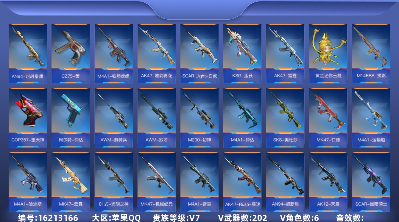 [16213166]6英雄角色数-196英雄武器数 【王者系列】:王者之戮,王者之影,王者之心,王者之神,王者之迹,王者之蝶,王者之兽,王者之狱,王者之隐,王者之霆,王者之业,COP 357-雷霆王者 【热门武器】:KSG-孟获,81式-光明之神,MK47-仁德,M4A1-仲达,M4A1-游骑兵,M200-幻神,AWM-妙才,AWM-游骑兵,VEPR12-宙斯,COP 357-堕天神,81式-阿波罗,CZS2-仲康,AN94-盖 【角色】:幽灵刀锋-觉醒,关小雨,晴雅,蝉,夏日灵狐-X,步练师 【英雄武器】:AK47-无影,AK47-火麒麟,AK47-Rush-星速,AK47-雷霆,AK47-雅韵青花,AK47-谜城烟火,M4A1-雷神,M4A1-黑骑士*2,M4A1-黑龙*2,M4A1-死神,M4A1-游骑兵,M4A1-仲达,M4A1-雷霆,M4A1-哈迪斯,M4A1-运输船,M4A1-千变,M4A1-铁胆虎魄,SCAR-幽暗骑士,SCAR Light-白虎,AN94-超新星,AN94-赳赳秦师,AN94-盖,M14EBR-暗夜,M14EBR-拂影,M14EBR-葫芦山庄,AK12-天启,81式-光明之神,MK47-机械纪元,MK47-云舞,MK47-仁德,SKS-美杜莎,G3A3-衍神兵,AWM-天龙,AWM-赛博时代,AWM-游骑兵,AWM-妙才,巴雷特-毁灭,巴雷特-极光*6,M200-幻神,TAC-天使,TAC-雷暴,寒霜烈龙*5,QCW05-变形金刚·大黄蜂,A180-地狱凤凰,CZS2-仲康,M12S-雷霆,M12S-天公,VEPR12-宙斯,AA12-竞界荣光,KSG-孟获,KSG-钟馗觉醒,贝雷塔-力拔山河,M1887-幽冥玄喵觉醒*2,USP-机械迷城,USP-仁德,沙鹰-修罗,沙鹰-宇航兔兔,蚩尤战弓觉醒,COP 357-堕天神,COP 357-雷霆王者,双管猎枪-威侯,柯尔特-仲达,CZ75-策,MK23-机械纪元,MK23-幻神,掠夺者P365-虹舞,白骨利刃,墨刃-幻神,雌雄双股剑,炽芒蝶刃*6,龙啸,神罚战斧*2,镰刀-哈迪斯,气勇胆烈戟,屠龙*14,尼泊尔-雷霆*3,穷奇铁扇,龙鳞-觉醒,麒麟刺,星芒,马来剑-毁灭,斩魔剑-天使,唐刀-华夏传说,方天画戟,擎天觉醒,铁锹-孟德,虚空之槌-妙才,丛林匕首-火力竞放觉醒,丛林匕首-庆龙觉醒,黄金迷你玉凝 【
