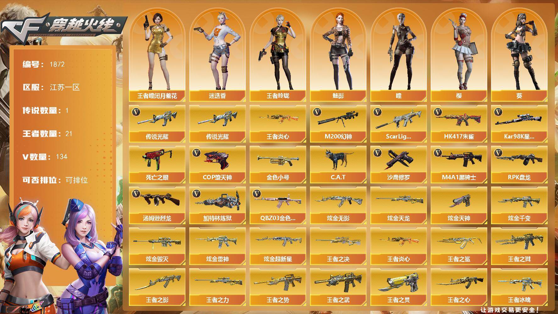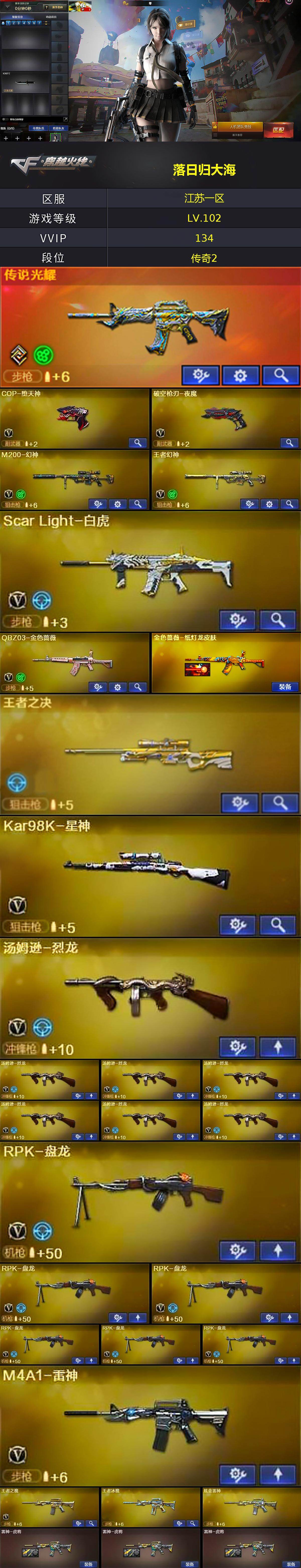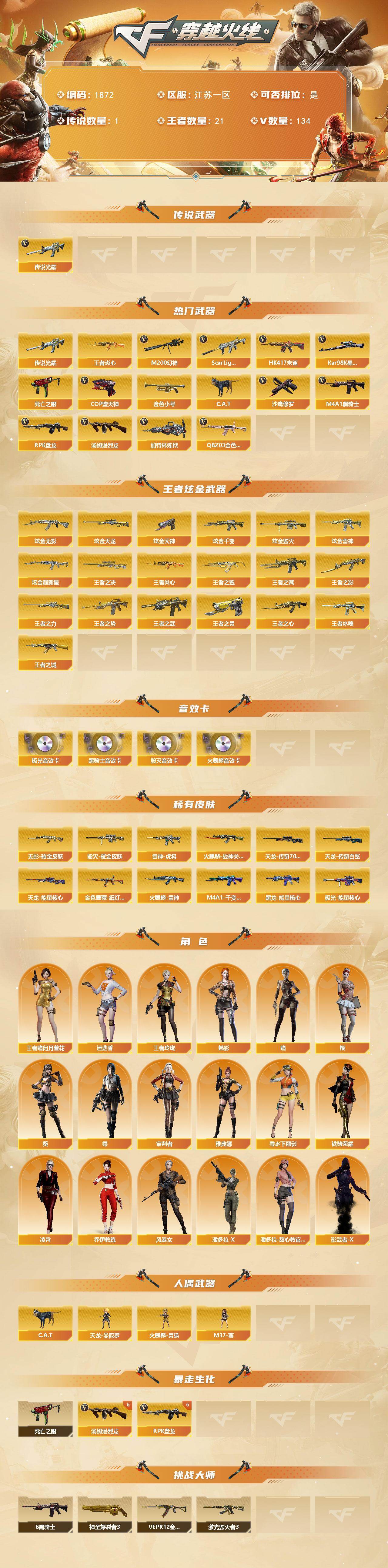[16213348]江苏一区-134V-21王者-13炫金 【传说武器】:传说光耀 【热门武器】:传说光耀,QBZ03-金色蔷薇,Scar Light-白虎,HK417-朱雀,M200-幻神,死亡之眼,王者炎心,Kar98K-星神,金色小号,C.A.T,M4A1-黑骑士*7,汤姆逊-烈龙*7,RPK-盘龙*6,加特林-炼狱,COP-堕天神,沙鹰-修罗*7 【王者炫金武器】:王者之城,王者冰魄,王者炎心,王者之鲨,王者之戮,王者之势,王者之武,王者之影,王者之心*2,王者之决,王者之力,王者之灵*2,炫金无影,炫金千变,炫金雷神,炫金超新星,炫金毁灭*5,炫金天龙*2,炫金天神*2 【音效卡】:AK47-火麒麟音效卡,M4A1-黑骑士音效卡,Barrett-毁灭音效卡,Barrett-极光音效卡 【皮肤】:金色蔷薇-纸灯龙皮肤,雷神-虎将*3,火麒麟-雷神,火麒麟-战神关羽,毁灭耀金皮肤,M4A1-千变-孔明皮肤,黑龙-能量核心,无影耀金皮肤,天龙-能量核心,AWM-天龙-传奇70KG,AWM-天龙-传奇白鲨,极光-能量核心 【角色】:零,葵,樱,瞳,魅影,迷迭香,凌霄,审判者,王者-瞳-闭月羞花,王者玲珑,乔伊教练,风暴女,零-水下丽影,潘多拉-X,潘多拉-甜心教官,铁骑荣耀,影武者-X,雅典娜 【人偶武器】:天龙-曼陀罗*2,火麒麟-灵狐*3,M37-葵,C.A.T 【暴走生化】:死亡之眼 【挑战大师】:神圣爆裂者III,VEPR-12-金魔*2,激光毁灭者III 【英雄级武器】:M4A1-千变*3,AK47-火麒麟*2,AK47-麒麟,M4A1-黑龙,M4A1-雷神,M4A1-黑骑士*7,AK47-无影,AK47-黑武士*3,AK12-天启*3,AN94-超新星,M4A1-武圣,M4A1-龙血,HK417-朱雀,Scar Light-白虎,M4A1-夜魔,M4A1-玫瑰精灵*2,QBZ03-金色蔷薇,M4A1-猎神*2,王者之魄-觉醒版,黑武士-CF网剧冠军,AWM-天龙*2,Barrett-毁灭*3,Barrett-极光*3,M200-幻神,Kar98K-星神,Barrett-金色蔷薇*5,王者幻神-觉醒版,RPK-盘龙*6,加特林-炼狱,汤姆逊-烈龙*7,AA-12-雷霆*7,沙鹰-修罗*7,沙鹰-天神,COP-堕天神,破空枪刃-夜魔,天神-CF网剧冠军,屠龙*7,龙啸,马来