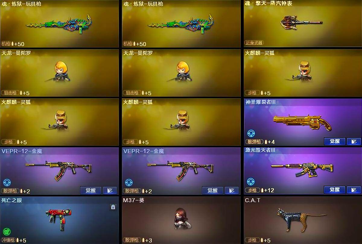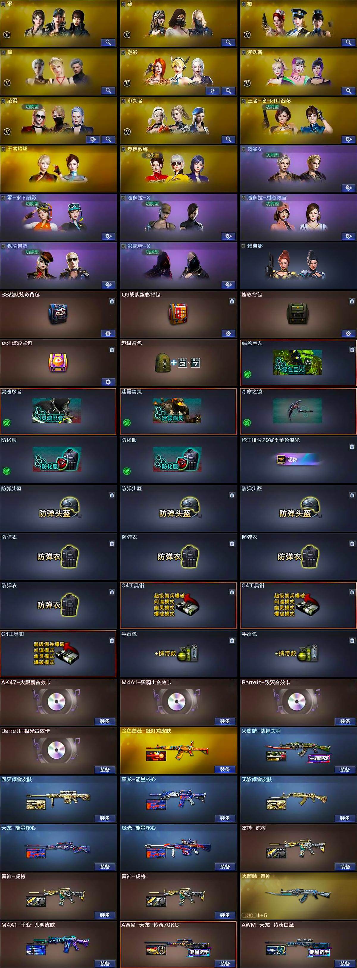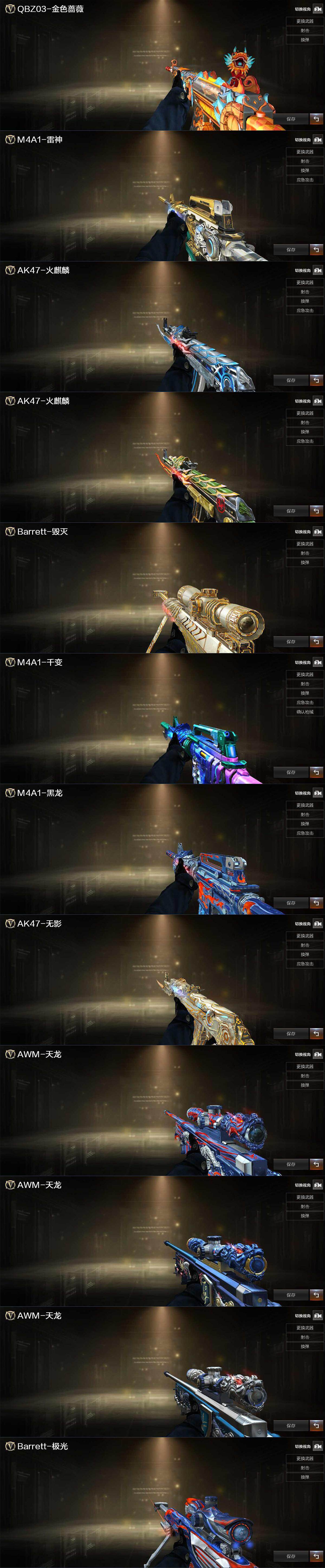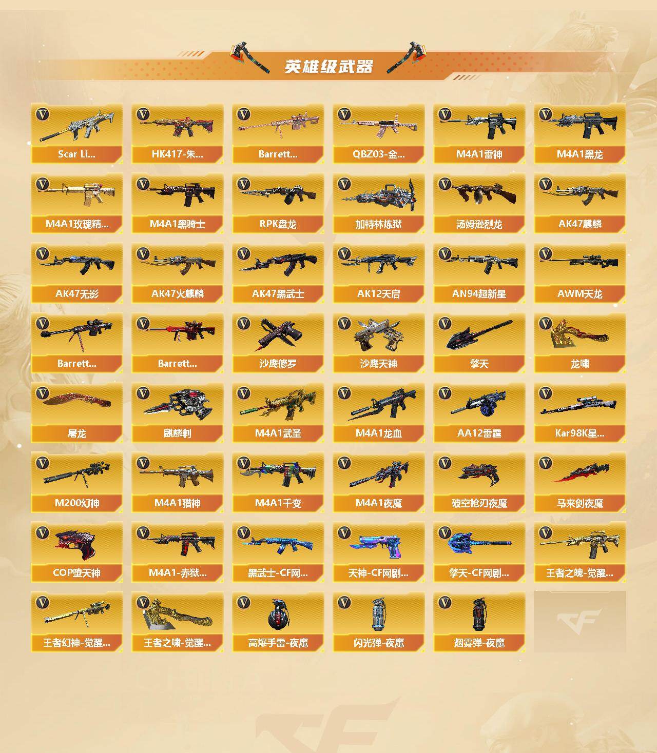【英雄级武器】:M4A1-千变*3,AK47-火麒麟*2,AK47-麒麟,M4A1-黑龙,M4A1-雷神,M4A1-黑骑士*7,AK47-无影,AK47-黑武士*3,AK12-天启*3,AN94-超新星,M4A1-武圣,M4A1-龙血,HK417-朱雀,Scar Light-白虎,M4A1-夜魔,M4A1-玫瑰精灵*2,QBZ03-金色蔷薇,M4A1-猎神*2,王者之魄-觉醒版,黑武士-CF网剧冠军,AWM-天龙*2,Barrett-毁灭*3,Barrett-极光*3,M200-幻神,Kar98K-星神,Barrett-金色蔷薇*5,王者幻神-觉醒版,RPK-盘龙*6,加特林-炼狱,汤姆逊-烈龙*7,AA-12-雷霆*7,沙鹰-修罗*7,沙鹰-天神,COP-堕天神,破空枪刃-夜魔,天神-CF网剧冠军,屠龙*7,龙啸,马来