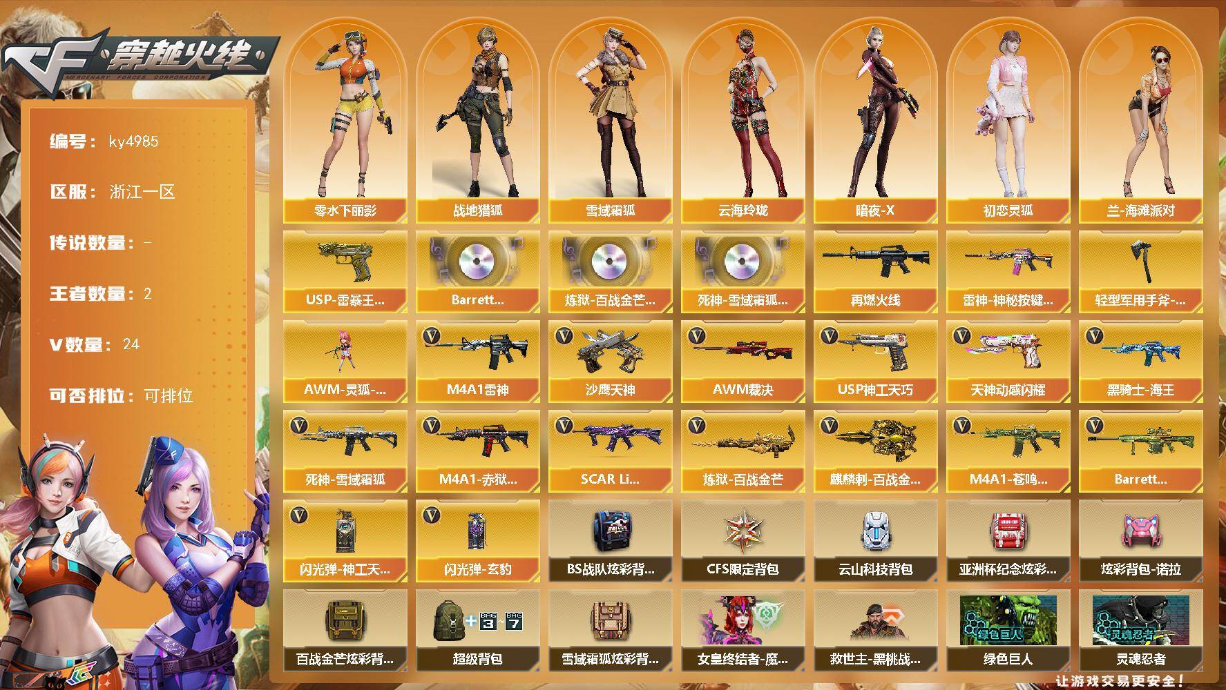 [16213445]浙江一区-24V-2王者-0炫金 【王者炫金武器】:USP-雷暴王者 【音效卡】:Barrett-碧霄极光音效卡,炼狱-百战金芒-庆典舞曲音效卡,死神-雪域霜狐-怀旧音效卡 【皮肤】:M4A1-再燃火线,雷神-神秘按键 皮肤,轻型军用手斧-再燃火线 【角色】:战地猎狐,雪域霜狐,云海玲珑,暗夜-X,初恋灵狐,兰-海滩派对,零-水下丽影,灵狐者-X,潘多拉-甜心教官,斯沃特-X 【人偶武器】:AWM-灵狐-15周年嘉年华 【英雄级武器】:M4A1-雷神,死神-雪域霜狐,SCAR Light-玄豹,黑骑士-海王,AWM-裁决,炼狱-百战金芒,沙鹰-天神,USP-神工天巧,天神-动感闪耀,麒麟刺-百战金芒,闪光弹-神工天巧,闪光弹-玄豹*2,M4A1-赤狱骑士,M4A1-苍鸣雷神,Barrett-碧霄极光 【道具】:BS战队炫彩背包,CFS限定背包,云山科技背包,亚洲杯纪念炫彩背包,炫彩背包-诺拉,百战金芒炫彩背包,超级背包,雪域霜狐炫彩背包,女皇终结者-魔龙之吻,救世主-黑桃战神,绿色巨人,灵魂忍者,迷雾幽灵*2,夺命之镰,防化服*3,枪王排位29赛季金色流光,语音特效-盛典烟火,雪域霜狐表情,萌萌小葵表情,防弹头盔,防弹衣,C4工具钳,手雷包 【特殊枪械】: