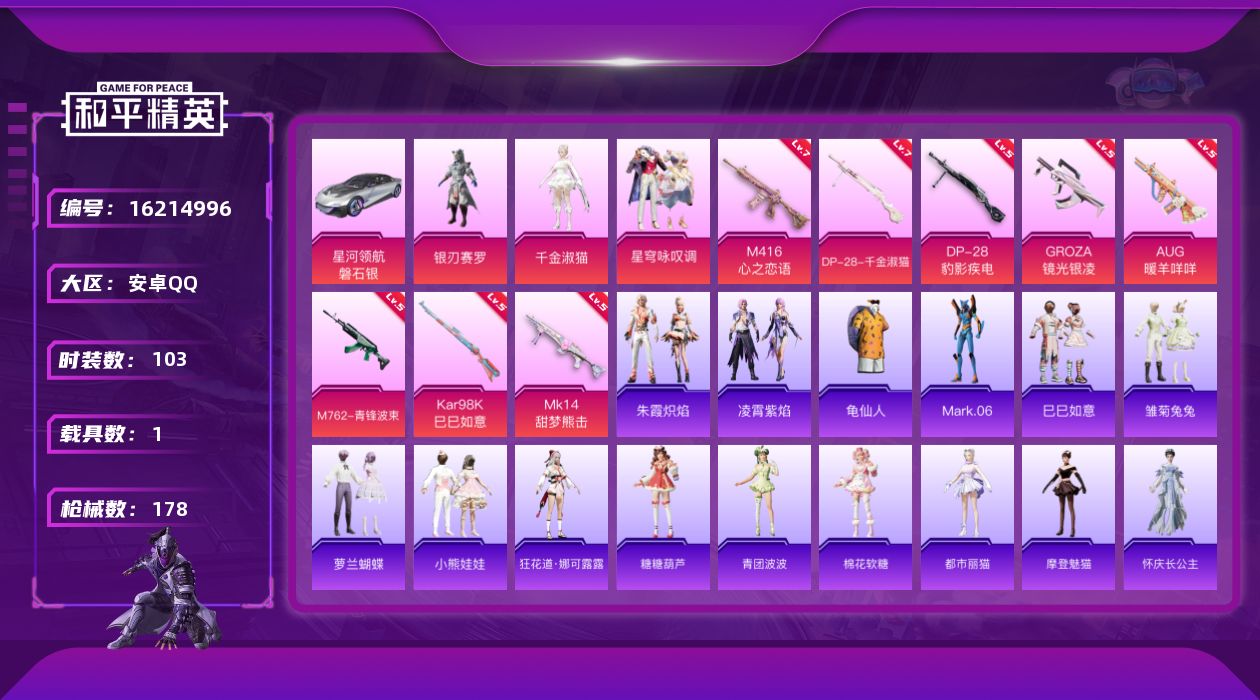 [16214996]【特价出售/店主推荐】安卓 手Q-3粉装-8特效枪-1载具-0粉色飞行器-54186热力值-9王牌印记-103套装-178枪皮