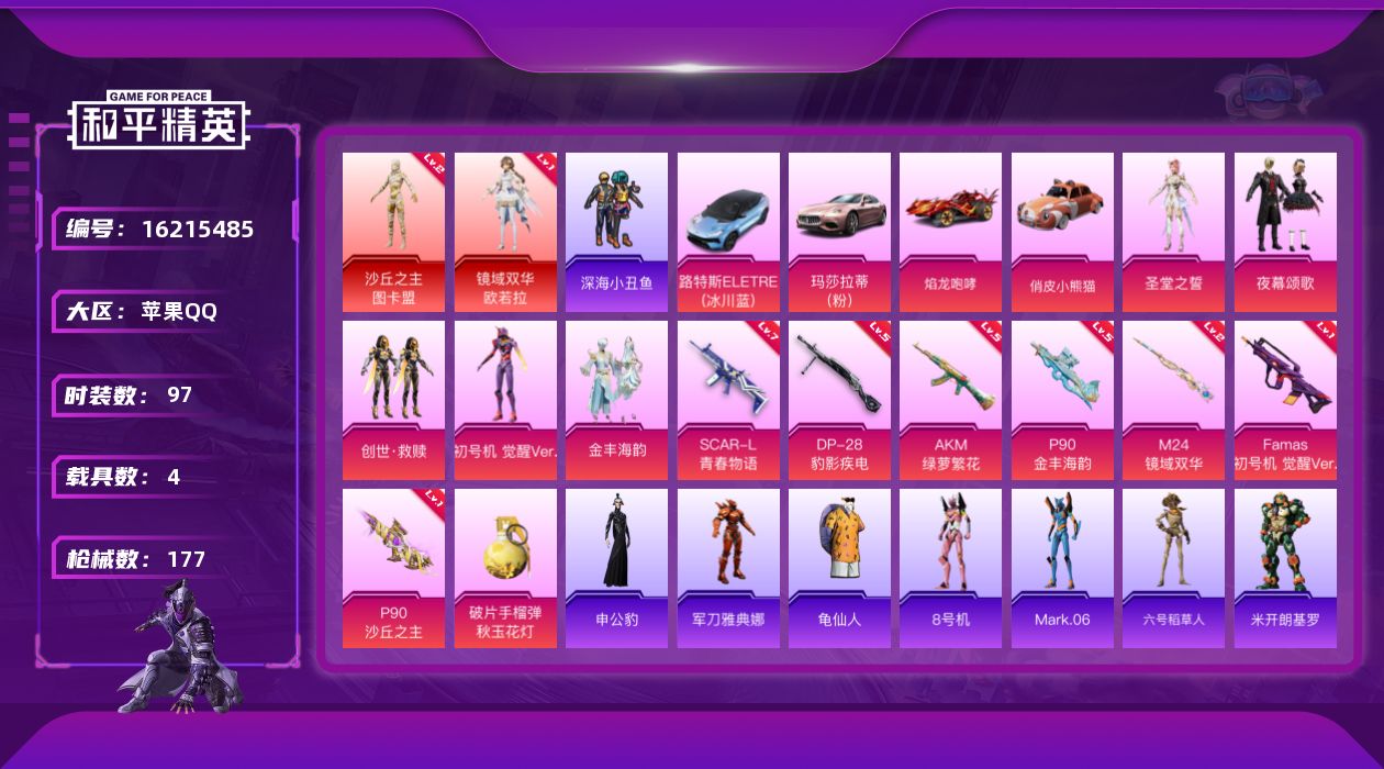 [16215485]【特价出售/店主推荐】苹果 手Q-2神装-5粉装-8特效枪-4载具-3粉色飞行器-60764热力值-1王牌印记-97套装-177枪皮