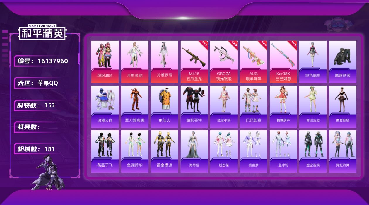 [16137960]【特价出售/店主推荐】苹果 手Q-无敌战神框-3粉装-4特效枪-0载具-1粉色飞行器-54646热力值-12王牌印记-153套装-181枪皮