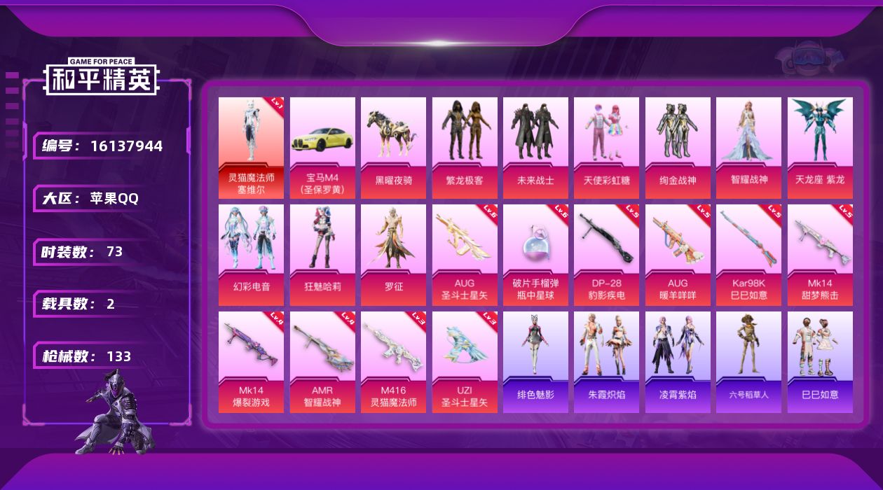 [16137944]苹果 手Q-1神装-9粉装-10特效枪-2载具-5粉色飞行器-43446热力值-4王牌印记-73套装-133枪皮