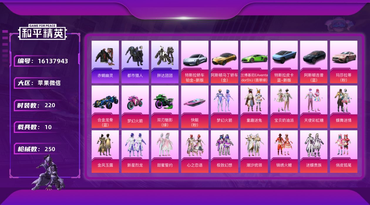 [16137943]【特价出售/店主推荐】苹果 微信-无敌战神框-24粉装-15特效枪-10载具-12粉色飞行器-129786热力值-22王牌印记-220套装-250枪皮