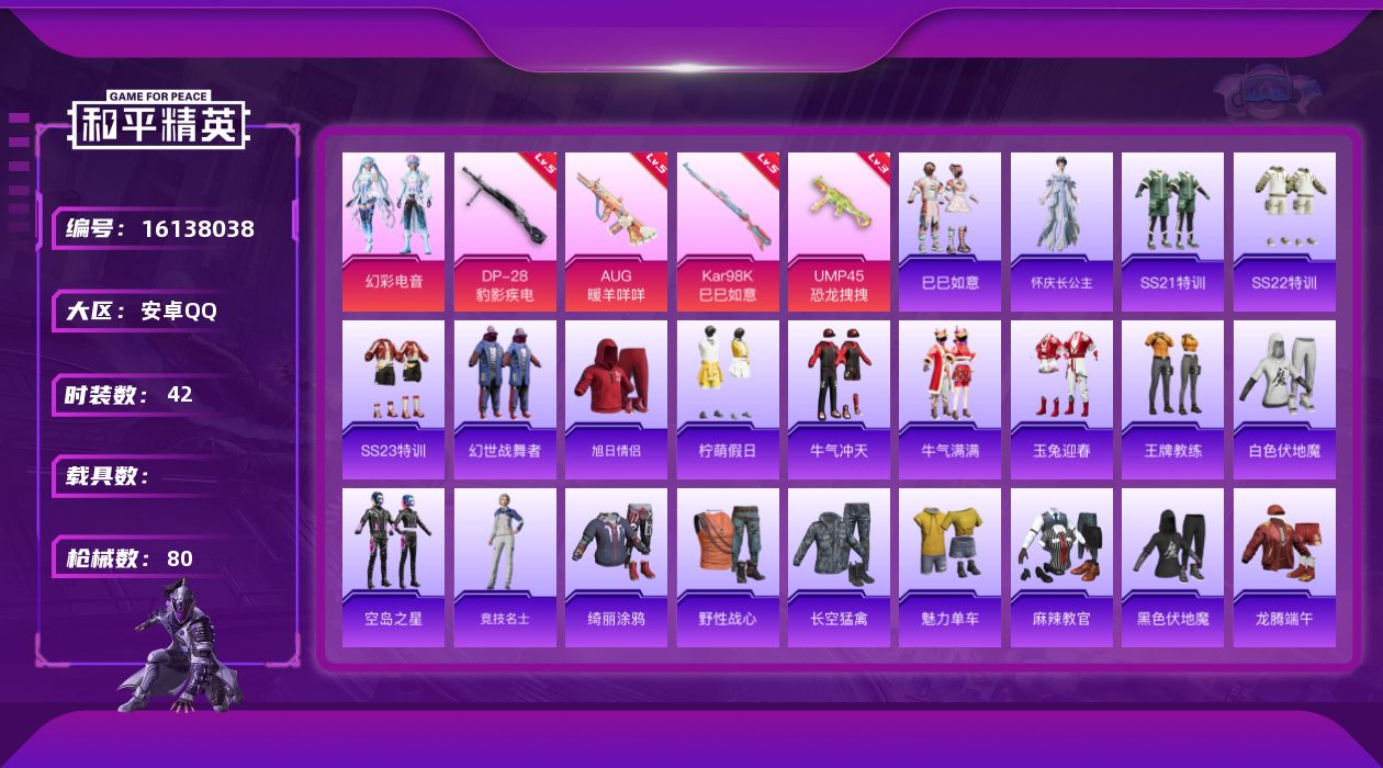 [16138038]【特价出售/店主推荐】安卓 手Q-1粉装-4特效枪-0载具-0粉色飞行器-20594热力值-2王牌印记-42套装-80枪皮 【粉色套装】:粉装-幻彩电音 【粉色枪皮等级】:AUG-暖羊咩咩(五级),UMP45-恐龙拽拽(三级),Kar98K-巳巳如意(五级),DP-28-豹影疾电(五级) 【粉色枪皮】:AUG-暖羊咩咩,UMP45-恐龙拽拽,Kar98K-巳巳如意,DP-28-豹影疾电 【粉色降落伞】:垂柳戏鸭降落伞,彩虹甜喵降落伞,未来歌姬降落伞 【稀有套装】:套装-巳巳如意,角色-怀庆长公主 【稀有枪皮】:AKM-彩虹符号,AKM-生命誓言,AKM-破晓战魂,AKM-龙的传人,SCAR-L-玉兔迎春,SCAR-L-红色方程式,M416-糯团青竹,M416-红色方程式,M416-蓝色火焰,AUG-耀粉歌者,QBZ-彩虹符号,M762-天降萌叽,AC-VAL-天降萌叽,蜜獾-垂柳戏鸭,蜜獾-天降萌叽,蜜獾-娇憨猪猪,UZI-娇憨猪猪,UZI-红色方程式,UMP45-蓝色火焰,汤姆逊-天降萌叽,汤姆逊-耀粉歌者,P90-巳巳如意,M24-炫彩节奏,AWM-垂柳戏鸭,SKS-炫彩节奏,SKS-糯团青竹,Mini14-耀粉歌者,SLR-娇憨猪猪,SLR-彩虹符号,S686-生命誓言,S686-红色方程式,S686-巳巳如意,S1897-炫彩节奏,S12K-垂柳戏鸭,S12K-娇憨猪猪,DBS-圣堂之誓,DBS-彩虹甜喵,M249-彩虹符号,M249-破晓战魂,DP-28-彩虹符号,MG3-幻世战舞者,R45-幻彩电音,破片手榴弹-巳巳如意 【其他套装】:套装-SS21特训,套装-SS22特训,套装-SS23特训,套装-幻世战舞者,套装-旭日情侣,套装-柠萌假日,套装-牛气冲天,套装-牛气满满,套装-玉兔迎春,套装-王牌教练,套装-白色伏地魔,套装-空岛之星,套装-竞技名士,套装-绮丽涂鸦,套装-野性战心,套装-长空猛禽,套装-魅力单车,套装-麻辣教官,套装-黑色伏地魔,套装-龙腾端午,套装-娇憨猪猪,套装-萌趣咩咩,套装-荷畔雨呱,套装-暖心橘喵 【营地ID】:910172842