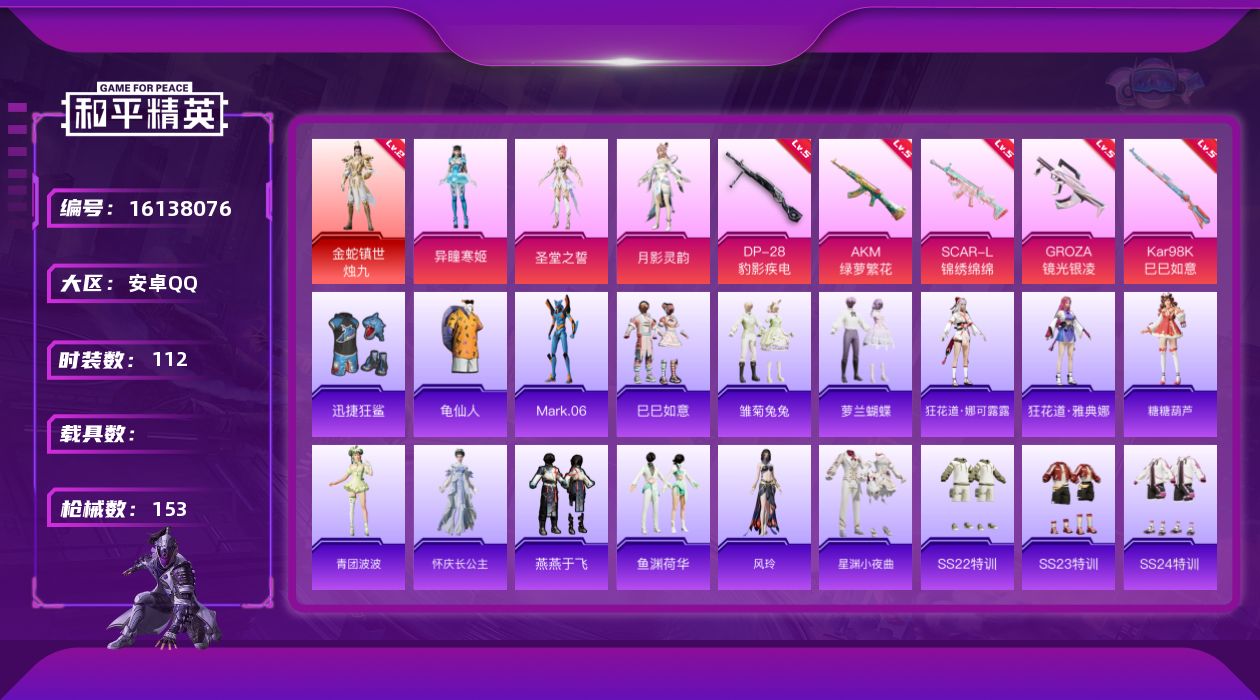 [16138076]【特价出售/店主推荐】安卓 手Q-1神装-3粉装-5特效枪-0载具-3粉色飞行器-46989热力值-6王牌印记-112套装-153枪皮
