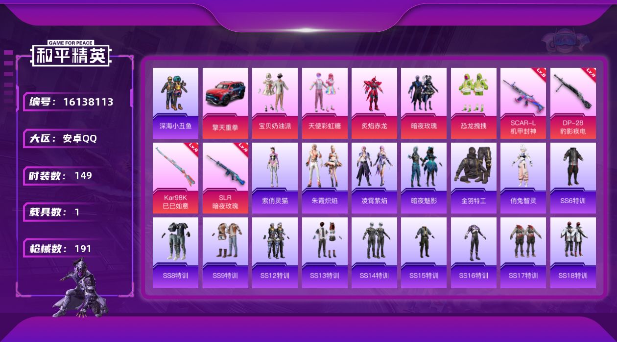 [16138113]【特价出售/店主推荐】安卓 手Q-5粉装-4特效枪-1载具-3粉色飞行器-59813热力值-1王牌印记-149套装-191枪皮 【热门品类】:套装-深海小丑鱼,套装-金羽特工 【粉色套装】:粉装-宝贝奶油派,粉装-天使彩虹糖,粉装-炙焰赤龙,粉装-暗夜玫瑰,粉装-恐龙拽拽 【粉色枪皮等级】:SCAR-L-机甲封神(六级),Kar98K-巳巳如意(四级),SLR-暗夜玫瑰(四级),DP-28-豹影疾电(四级) 【粉色载具】:擎天重拳 【粉色枪皮】:SCAR-L-机甲封神,Kar98K-巳巳如意,SLR-暗夜玫瑰,DP-28-豹影疾电 【粉色飞行器】:梦幻火箭飞行器,齐天大圣飞行器 【粉色降落伞】:幻影战神降落伞,甜心宝贝降落伞,PEL轰鸣竞梦者降落伞,四圣焕新降落伞,马卡龙降落伞,潮汐统领降落伞,夏日绵绵冰降落伞,暗夜玫瑰降落伞,洛神天依降落伞,环太平洋降落伞,炫光之旅降落伞,月影灵韵降落伞,炫彩糖果降落伞 【稀有套装】:角色-俏兔智灵,套装-朱霞炽焰,套装-凌霄紫焰,角色-紫俏灵猫,套装-炫彩糖果 【稀有枪皮】:AUG-冰晶雪宝,AKM-夜灯,AKM-破晓战魂,AKM-萌趣颜团子,AKM-虎虎生威,AKM-锦绣火鲤,AKM-龙的传人,M16A4-幻世战舞者,M16A4-甜心亚梦,M16A4-红色方程式,M16A4-蓝色火焰,SCAR-L-暗夜玫瑰,SCAR-L-炫彩节奏,SCAR-L-玉兔迎春,SCAR-L-红色方程式,SCAR-L-黄金龙骨,M416-糯团青竹,M416-红色方程式,M416-蓝色火焰,GROZA-异彩先驱,GROZA-春暖花开,GROZA-林间仙鹿,GROZA-治愈之星,GROZA-马卡龙,AUG-耀粉歌者,AUG-青春冒险家,AUG-月影灵韵,QBZ-原初圣火,QBZ-彩虹符号,QBZ-洛神天依,QBZ-潮汐统领,QBZ-电玩视界,M762-天降萌叽,M762-奇异狩猎者,M762-牛气冲天,M762-瑞龙福将,M762-甜心宝贝,M762-镭射皇者,Mk47-洛神天依,Mk47-青春冒险家,G36C-时空追击者,G36C-暗夜玫瑰,AC-VAL-天降萌叽,AC-VAL-甜心亚梦,蜜獾-娇憨猪猪,ARX-凌霄紫焰,UZI-娇憨猪猪,UZI-炫彩节奏,UZI-红色方程式,UMP45-夜灯,UMP45-时空追击者,UMP45-生命誓言,UMP45