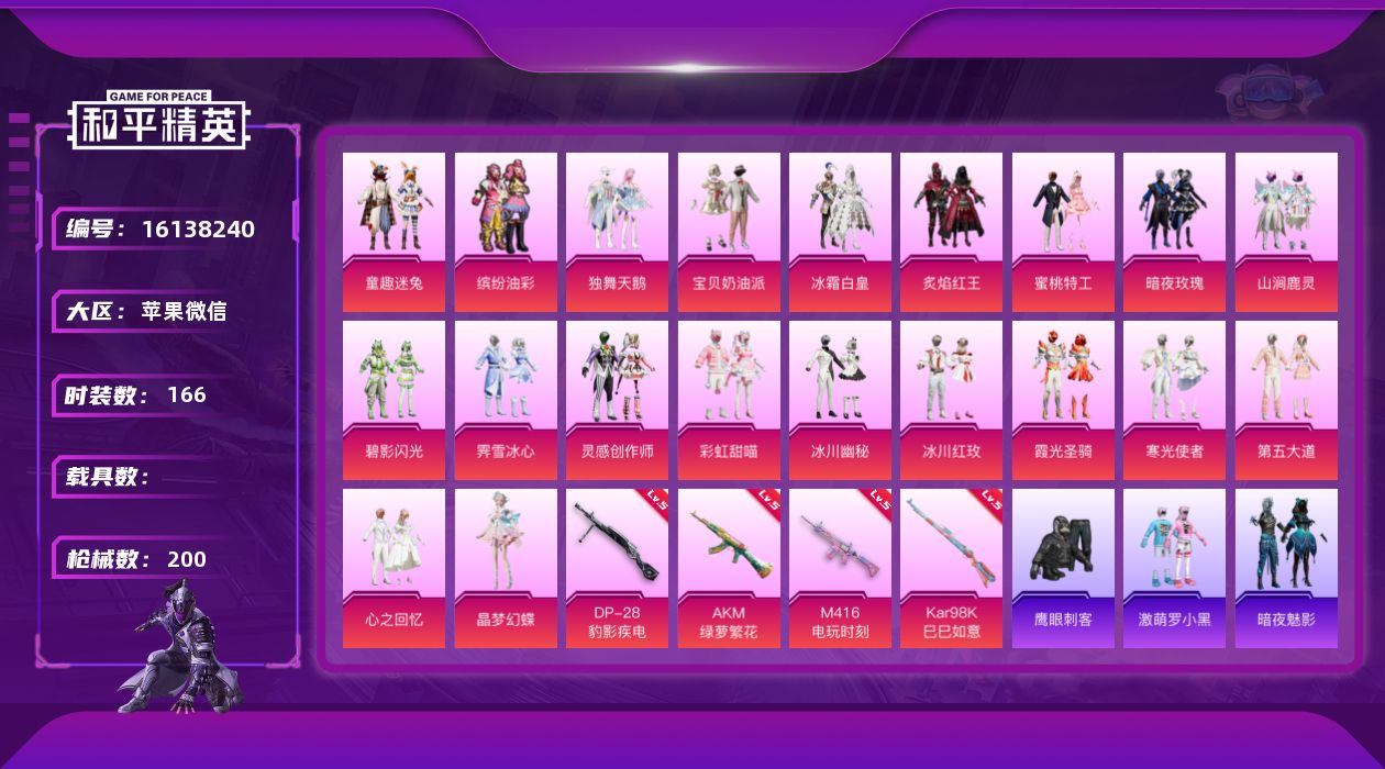 [16138240]【特价出售/店主推荐】苹果 微信-20粉装-4特效枪-0载具-2粉色飞行器-71084热力值-11王牌印记-166套装-200枪皮