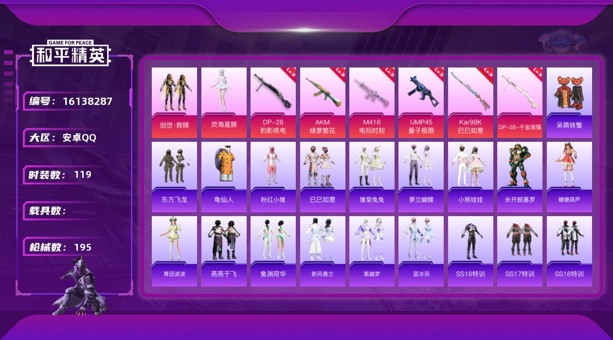- [12132168]11粉装 6特效枪 1载具 5印记 可二次 可修改实名 身法装备:都市猎人,暗影哥特(红眼罩) 优质装备:玛莎拉蒂Quattroporte(夜幕蓝),都市猎人,SCAR-L梦幻火箭,AKM甜心宝贝,M416心之恋语,奇异狩猎者,梦幻火箭(新101)(新火箭少女101粉色套装),宝贝奶油派,天使彩虹糖,放客神游,M16A4垂柳戏鸭,SPAS-12音爆索尼克 热门装扮:恐龙拽拽,霁雪冰心,垂柳戏鸭,冰川幽秘,海螺星光,第五大道,未来歌姬,奶芙汪汪,恶魔喵喵,迅捷狂鲨,鹰眼刺客,呆萌铁蟹,深海小丑鱼,都市猎人 稀有枪皮:DP-28-豹影疾电 五级特效枪:五级M416-心之恋语,五级SCAR-L-梦幻火箭,五级AKM-甜心宝贝,五级SPAS-12-音爆索尼克 四级特效枪:四级DP-28-豹影疾电 三级特效枪:三级M16A4-垂柳戏鸭 紫色装扮:幻彩翩翩,SS23特训,妙红点点,青涩时光,灵蜜圈圈,飞狐塔尔斯,碧波幻想,SS21特训,熠彩粉晶,田园牧歌,轻风白浪,和煦暖阳,SS22特训,莱茵河畔,冷焰舞者,千禧之恋,坚韧舞者,夏日倾情,夏日音浪,幻世战舞者,冰川特警,萌趣咩咩,军械专家,娇憨猪猪,SS20特训,甜心亚梦,虚音幻奏,俏皮奶喵,夏雨游龙,智慧隐士,英勇保护者,豚鼠丹丹,雪兔飞飞,飞驰魅影,音速流光,SS19特训,飞行日记,魅力单车,鹤鸣,麻辣教官,龙的传人,龙腾端午,龟仙人,霓虹街区,酷潮明星,都市漫游者,野性战心,长空猛禽,绛羽幽主,涂山之恋,炫蓝之夏,牛气冲天,牛气满满,探宝勇士,极地朋克,柠萌假日,红色运动,绮丽涂鸦,缤纷果语,荣耀,荷畔雨呱,虎虎生威吉莉,特殊使命,特训学院,狂沙舞者,猛禽,王牌教练,空岛之星,疯狂小兔子,白熊同盟,白色伏地魔,短笛,玉兔迎春,竞技名士,暗影哥特(红眼罩),惊鸿侠骨,甜梦熊熊,神气柴柴,懵萌河马,SS24特训(SS24特训套装),SS25特训,绝对偶像,锦衣飞扬,SS27特训,Alan Walker,蝶吟花词,浪漫天命,日照花林,SS26特训,春光漫游,快闪甜心,玲珑飞花,纯白誓言,青玉碎影,绯格组合,光之冒险,恶魔人蛛,漫步者,冰冻风暴,弄潮海豚,蓝调潮人 优质战备:精灵梦叶罗丽降落伞,恐龙拽拽降落伞,金风玉露降落伞,旋转彩虹降落伞,甜梦小狐降落伞,青空秋雨降落伞,彩虹甜喵降落伞,环太平洋降落伞,垂柳戏鸭降落伞,天星战神