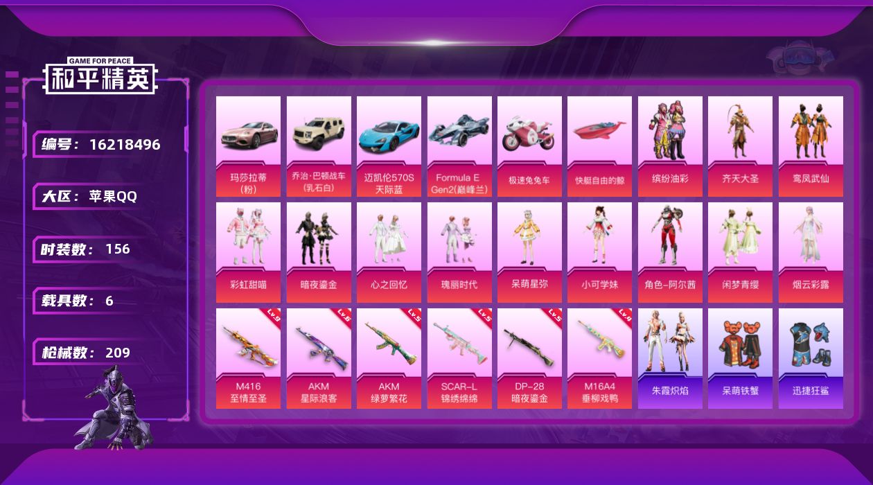 [16218496]【特价出售/店主推荐】苹果 手Q-12粉装-6特效枪-6载具-5粉色飞行器-7.6w热力值-14王牌印记-156套装-209枪皮【热门品类】:粉装-缤纷油彩,套装-龟仙人,套装-粉红小猪【粉色套装】:粉装-缤纷油彩,粉装-齐天大圣,粉装-鸾凤武仙,粉装-彩虹甜喵,粉装-暗夜鎏金,粉装-心之回忆,粉装-瑰丽时代,角色-呆萌星弥,角色-小可学妹,角色-阿尔茜,粉装-闲梦青缨,角色-烟云彩露粉色枪皮等级】:AKM-星际浪客(六级),AKM-绿萝繁花(五级),M16A4-垂柳戏鸭(四级),SCAR-L-锦绣绵绵(五级),M416-至情至圣(九级),DP-28-暗夜鎏金(五级)【粉色载具】:玛莎拉蒂Ghibli(粉),乔治巴顿战车(乳石白),迈凯伦570S(天际蓝),Formula E Gen2(巅峰兰),极速兔兔车,僚机-萌兔起飞,快艇-自由的鲸【粉色枪皮】:AKM-星际浪客,AKM-绿萝繁花,M16A4-垂柳戏鸭,SCAR-L-锦绣绵绵,M416-至情至圣,DP-28-暗夜鎏金【粉色飞行器】:齐天大圣飞行器,梦幻舞会飞行器,变形金刚飞行器,沙丘之主天马,冠军兔兔飞行器