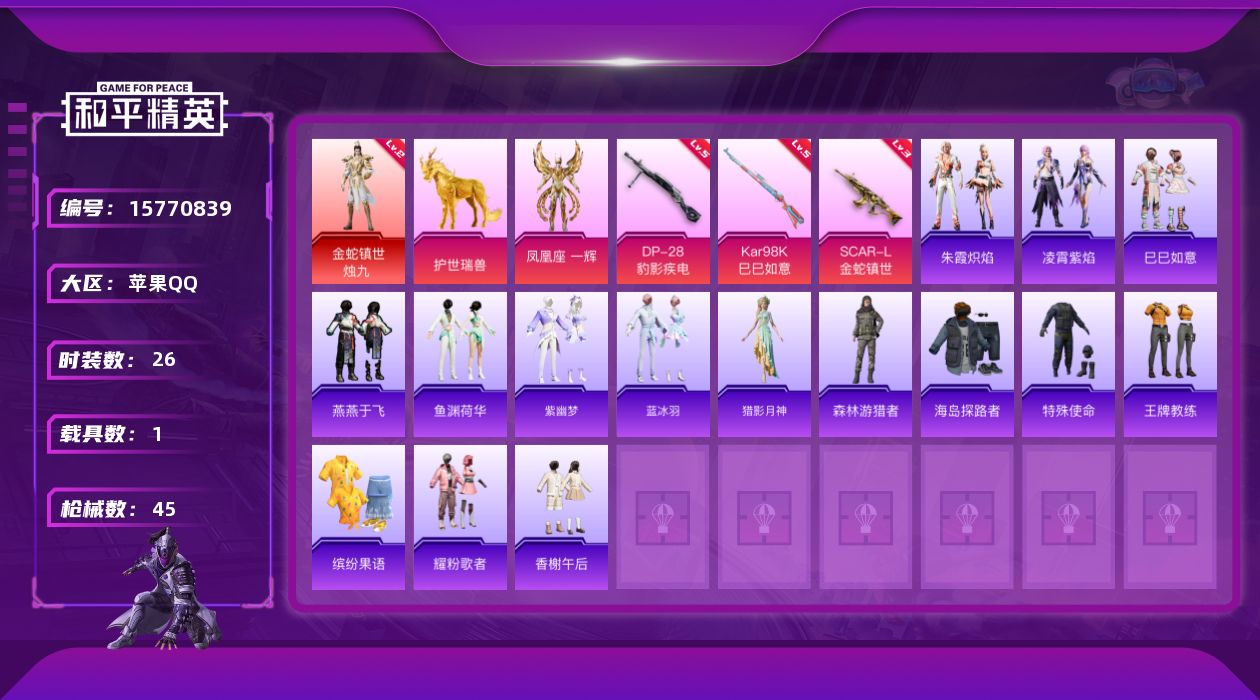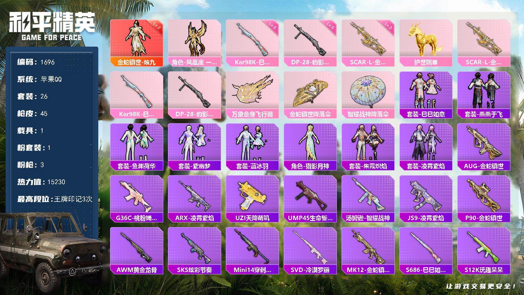 [15770839]【1696】苹果 手Q-1神装-1粉装-3特效枪-1载具-1粉色飞行器-15230热力值-3王牌印记-26套装-45枪皮 【红色神装等级】:金蛇镇世-烛九(二级) 【红色角色神装】:金蛇镇世-烛九 【粉色载具】:护世瑞兽 【粉色套装】:角色-凤凰座 一辉 【粉色枪皮等级】:SCAR-L-金蛇镇世(三级),Kar98K-巳巳如意(五级),DP-28-豹影疾电(五级) 【粉色枪皮】:SCAR-L-金蛇镇世,Kar98K-巳巳如意,DP-28-豹影疾电 【粉色飞行器】:万象金身飞行器 【粉色降落伞】:金蛇镇世降落伞,智耀战神降落伞 【稀有套装】:套装-巳巳如意,套装-燕燕于飞,套装-鱼渊荷华,套装-紫幽梦,套装-蓝冰羽,角色-猎影月神,套装-朱霞炽焰,套装-凌霄紫焰 【稀有枪皮】:AUG-金蛇镇世,G36C-桃粉嫣然,ARX-凌霄紫焰,UZI-天降萌叽,UMP45-生命誓言,汤姆逊-智耀战神,JS9-凌霄紫焰,P90-金蛇镇世,AWM-黄金龙骨,SKS-炫彩节奏,Mini14-穿刺龙虾,SVD-冷漠罗丽,MK12-金蛇镇世,S686-巳巳如意,S12K-玩趣呆呆,S12K-智耀战神,DP-28-彩虹符号,MG3-幻世战舞者,MG3-智耀战神,MG-36-凌霄紫焰,P92-凌霄紫焰,平底锅-凌霄紫焰,破片手榴弹-巳巳如意 【其他套装】:套装-森林游猎者,套装-海岛探路者,套装-特殊使命,套装-王牌教练,套装-缤纷果语,套装-耀粉歌者,套装-香榭午后 【稀有头盔】:甜心宝贝头盔(1级),深海小丑鱼头盔(1级),金羽特工头盔(3级),金羽特工头盔(2级),金羽特工头盔(1级) 【稀有背包】:甜心宝贝背包(2级),深海小丑鱼背包(1级),金羽特工背包(3级),金羽特工背包(2级),金羽特工背包(1级) 【营地ID】:975356016