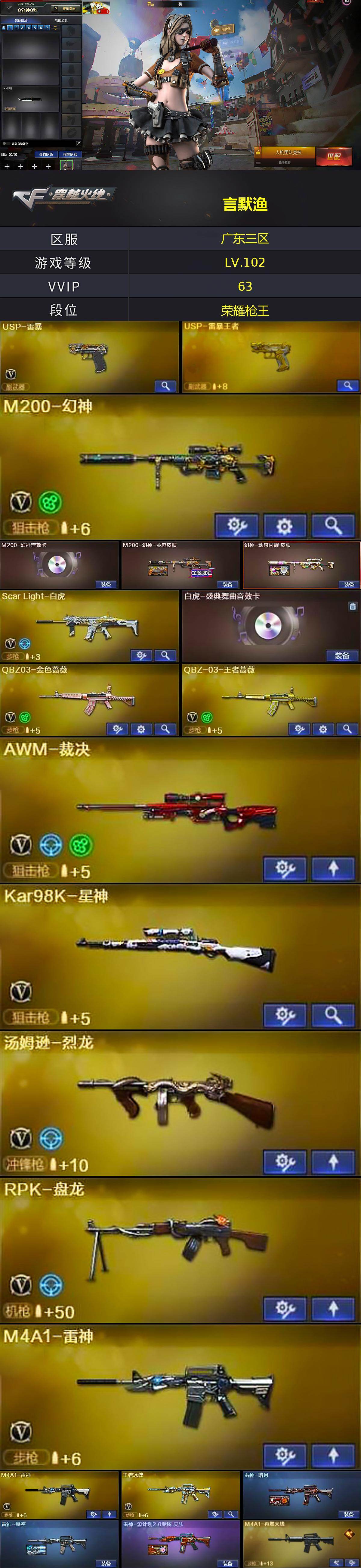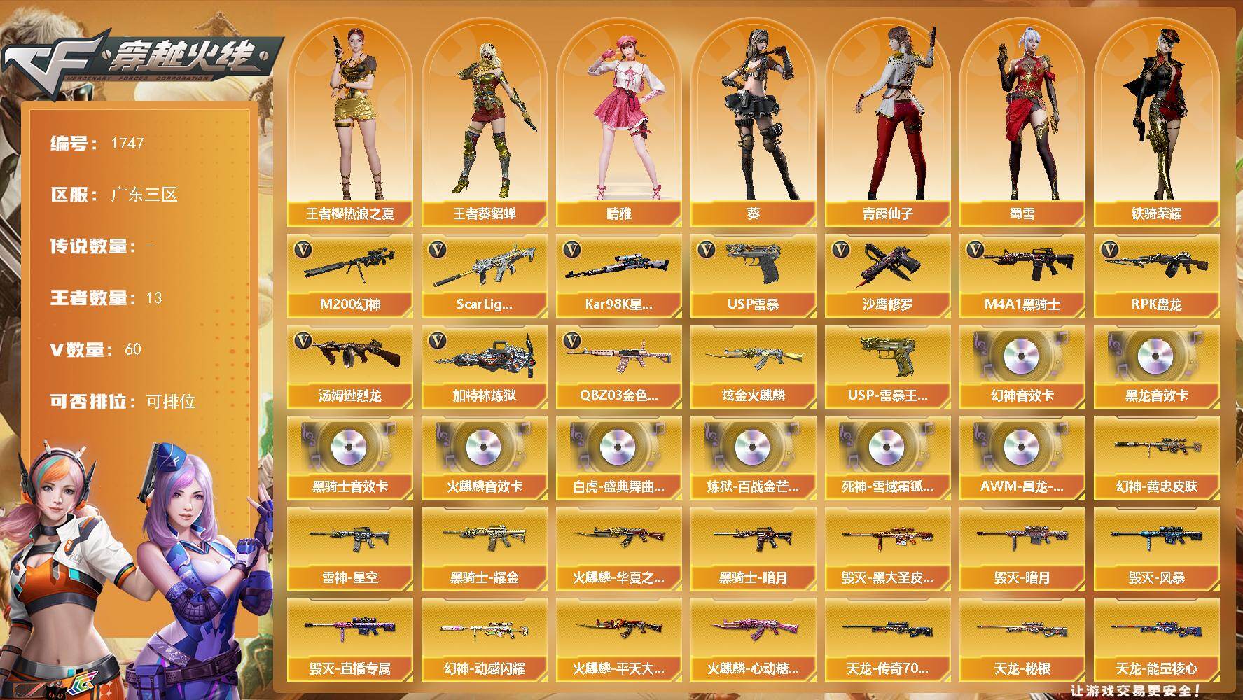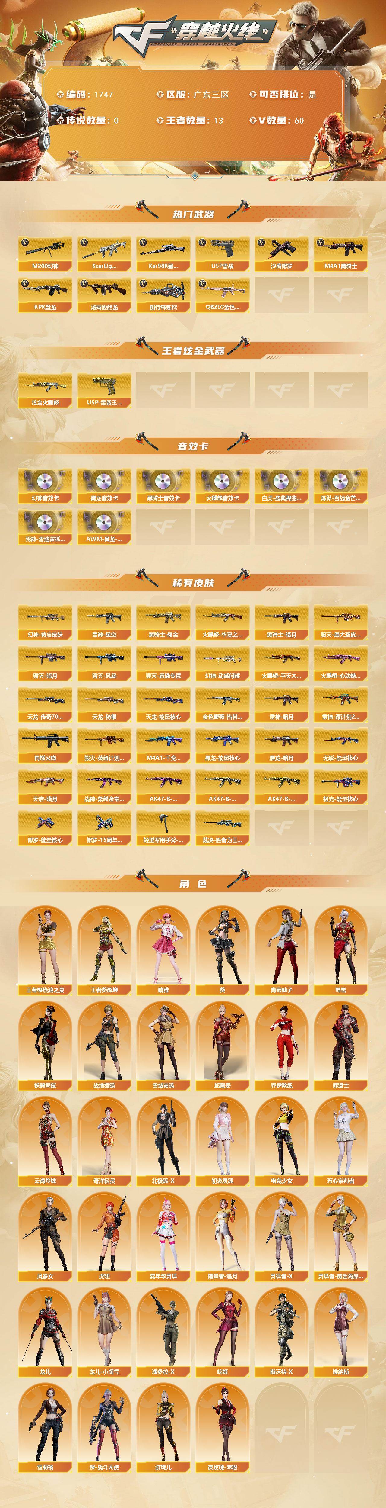[15977510]广东三区-60V-13王者-1炫金 【热门武器】:QBZ03-金色蔷薇,Scar Light-白虎,M200-幻神,Kar98K-星神,M4A1-黑骑士,汤姆逊-烈龙,RPK-盘龙,加特林-炼狱,USP-雷暴,沙鹰-修罗 【王者炫金武器】:USP-雷暴王者,炫金火麒麟 【音效卡】:M200-幻神音效卡,AK47-火麒麟音效卡,M4A1-黑龙音效卡,M4A1-黑骑士音效卡,白虎-盛典舞曲音效卡,炼狱-百战金芒-庆典舞曲音效卡,死神-雪域霜狐-怀旧音效卡,AWM-昌龙-怀旧音效卡 【皮肤】:M200-幻神-黄忠皮肤,幻神-动感闪耀 皮肤,金色蔷薇-热带奇洋 皮肤,裁决-胜者为王 皮肤,雷神-暗月,雷神-星空,雷神-源计划2.0专属 皮肤,M4A1-再燃火线,火麒麟-华夏之心,火麒麟-平天大圣,火麒麟-心动糖果,毁灭-暗月,毁灭-黑大圣皮肤,毁灭-风暴*2,毁灭-直播专属,毁灭-英雄计划 皮肤,M4A1-千变-孔明皮肤,黑龙-能量核心,黑龙-暗月,黑骑士-暗月,黑骑士耀金皮肤,无影-能量核心,天启-暗月,战神-紫绶金章皮肤,AK47-B-常胜将军-曹操*2,AK47-B-常胜将军-刘备,AK47-B-常胜将军-孙权*2,天龙-秘银,天龙-能量核心,AWM-天龙-传奇70KG,极光-能量核心,修罗-能量核心,修罗-15周年嘉年华 皮肤,轻型军用手斧-再燃火线 【角色】:葵,晴雅,战地猎狐,王者樱-热浪之夏,王者-葵-貂蝉,雪域霜狐,蛇隐宗,奇洋探员,乔伊教练,修道士,云海玲珑,北极狐-X,初恋灵狐,电竞少女,芳心审判者,风暴女,虎妞,嘉年华灵狐,猎狐者-追月,灵狐者-X,灵狐者-黄金海岸,龙儿,龙儿-小淘气,潘多拉-X,青霞仙子,蛇姬,斯沃特-X,蜀雪,铁骑荣耀,维纳斯,雪莉杨,夜玫瑰-宠粉,樱-战斗天使,游珑儿 【人偶武器】:海滩汪汪-巴雷特,迷你牛魔王,闪光弹-小乔,闪光弹-貂蝉,高爆手雷-大乔,迷你艾比,迷你超能女侍 【暴走生化】:超级对讲机 【挑战大师】:火狱乱世-超越Max,冰龙粉碎者-白马银枪 【英雄级武器】:M4A1-千变,AK47-火麒麟,M4A1-黑龙,M4A1-雷神*2,M4A1-黑骑士,AK47-无影,M4A1-死神,AK47-黑武士,AK12-天启,AN94-超新星,M4A1-龙血,Scar Light-白虎,无影-神兵利器,黑武士-锦绣游龙,死神