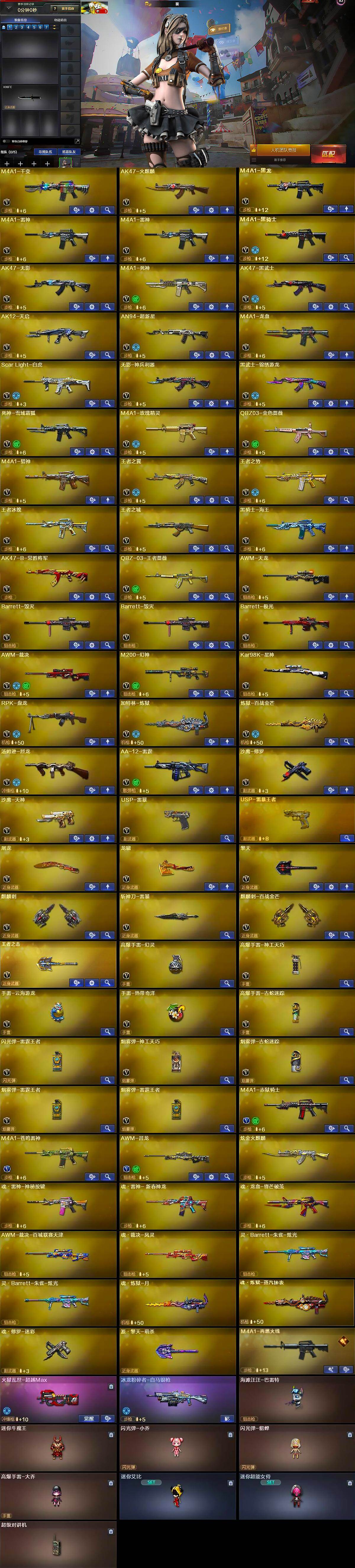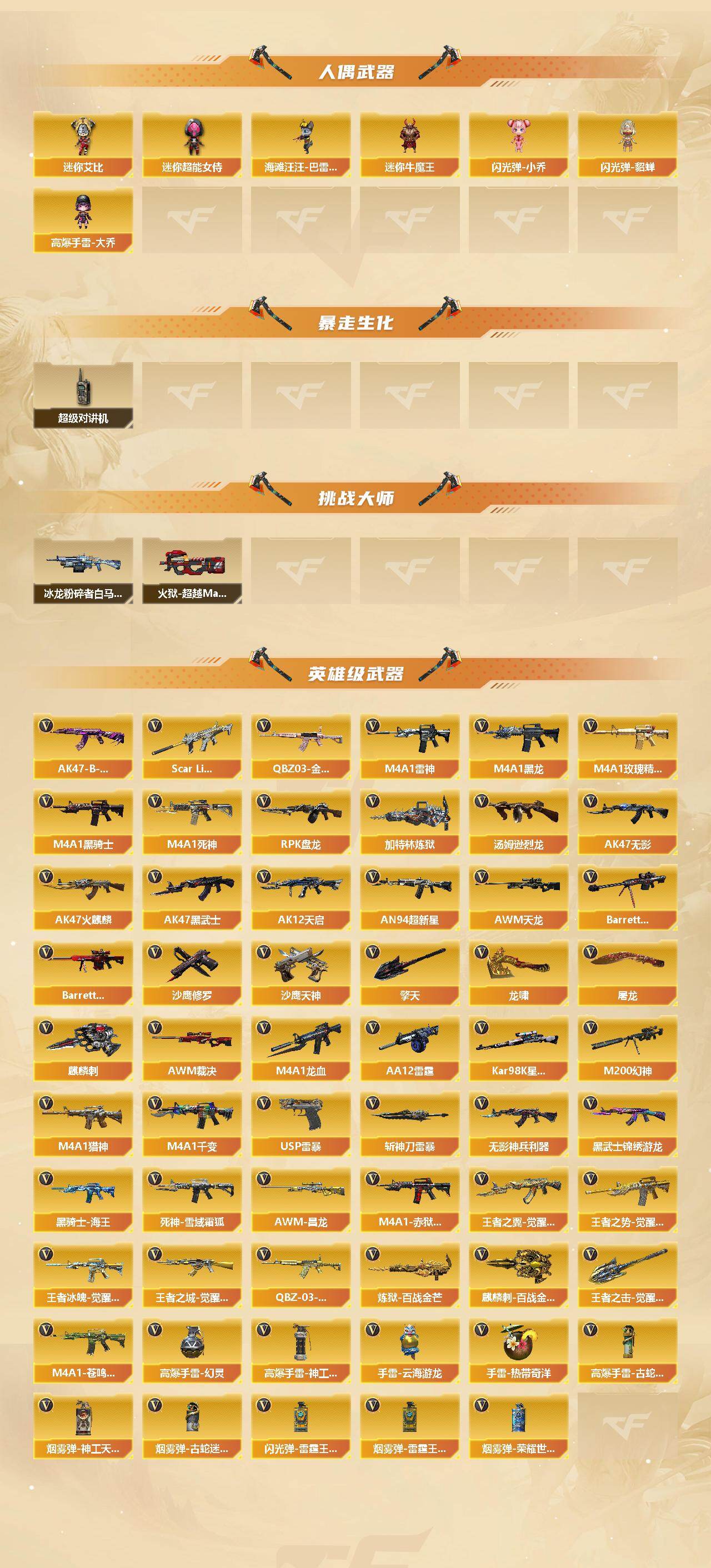 【英雄级武器】:M4A1-千变,AK47-火麒麟,M4A1-黑龙,M4A1-雷神*2,M4A1-黑骑士,AK47-无影,M4A1-死神,AK47-黑武士,AK12-天启,AN94-超新星,M4A1-龙血,Scar Light-白虎,无影-神兵利器,黑武士-锦绣游龙,死神