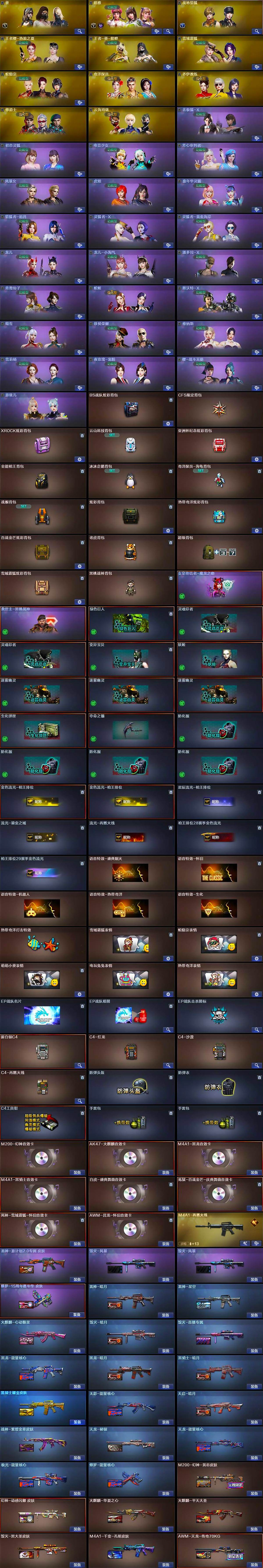 【音效卡】:M200-幻神音效卡,AK47-火麒麟音效卡,M4A1-黑龙音效卡,M4A1-黑骑士音效卡,白虎-盛典舞曲音效卡,炼狱-百战金芒-庆典舞曲音效卡,死神-雪域霜狐-怀旧音效卡,AWM-昌龙-怀旧音效卡