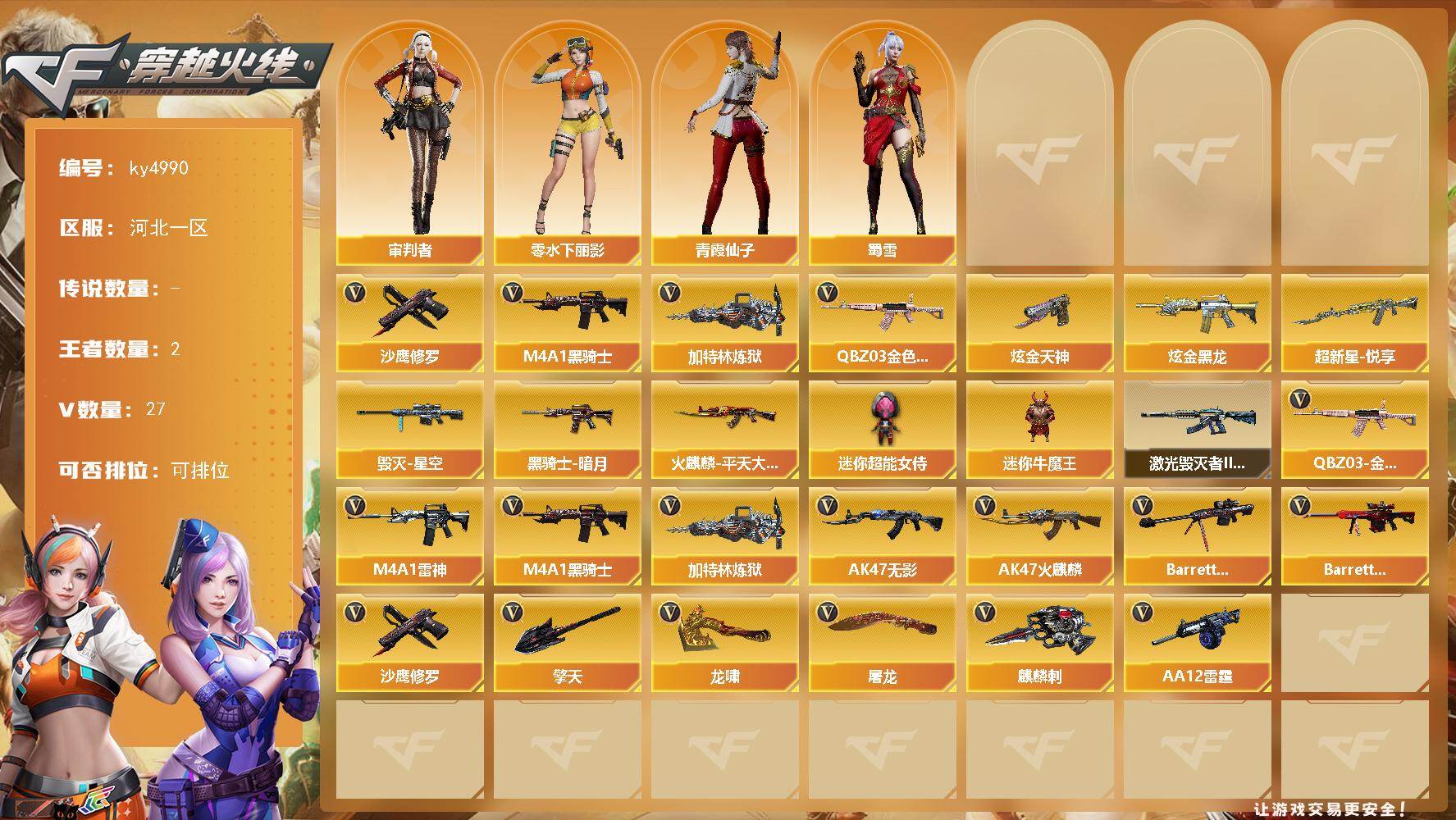 [16227628]河北一区-27V-2王者-2炫金 【热门武器】:QBZ03-金色蔷薇,M4A1-黑骑士,加特林-炼狱,沙鹰-修罗 【王者炫金武器】:炫金天神,炫金黑龙,超新星-悦享 【稀有皮肤】:火麒麟-平天大圣,黑骑士-暗月,毁灭-星空 【角色】:零-水下丽影,审判者,蜀雪,青霞仙子 【人偶武器】:迷你超能女侍,迷你牛魔王 【挑战大师】:激光毁灭者III-白马银枪 【英雄级武器】:QBZ03-金色蔷薇,M4A1-雷神*2,M4A1-黑骑士,加特林-炼狱,AK47-无影*3,AK47-火麒麟,Barrett-毁灭,Barrett-极光,AA-12-雷霆,沙鹰-修罗,麒麟刺*2,擎天,龙啸,屠龙 【特殊枪械】:1黑骑士,1炼狱