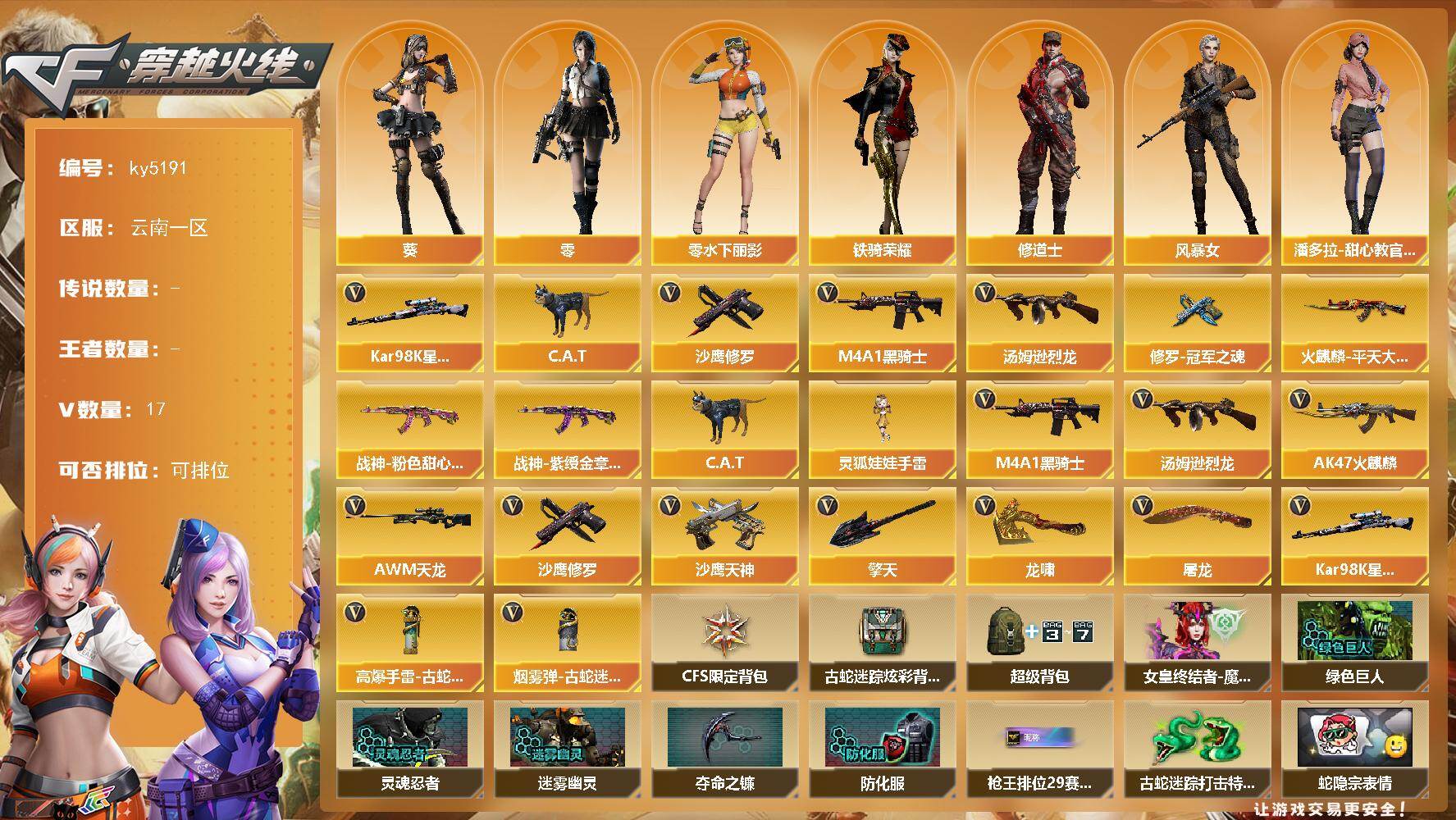 [16228497]云南一区-17V-0王者-0炫金 【热门武器】:Kar98K-星神,C.A.T,M4A1-黑骑士,汤姆逊-烈龙,沙鹰-修罗*2 【皮肤】:火麒麟-平天大圣,战神-粉色甜心皮肤,战神-紫绶金章皮肤,修罗-冠军之魂 【角色】:零,葵,妮妮,修道士,风暴女,零-水下丽影,潘多拉-甜心教官,蛇姬,铁骑荣耀,雪莉杨,樱-战斗天使,影武者-X 【人偶武器】:C.A.T,灵狐娃娃手雷 【英雄级武器】:AK47-火麒麟,M4A1-黑骑士,AWM-天龙,Kar98K-星神,汤姆逊-烈龙,沙鹰-修罗*2,沙鹰-天神*3,屠龙,龙啸*2,擎天,高爆手雷-古蛇迷踪,烟雾弹-古蛇迷踪 【道具】:CFS限定背包,古蛇迷踪炫彩背包,超级背包,女皇终结者-魔龙之吻,绿色巨人,灵魂忍者,迷雾幽灵,夺命之镰,防化服*3,枪王排位28赛季金色流光,枪王排位29赛季金色流光,古蛇迷踪打击特效,蛇隐宗表情,电玩兔兔表情,EP战队名片,EP战队喷图,EP战队击杀图标,防弹头盔*6,防弹衣*6,C4工具钳*7,手雷包*7 【特殊枪械】:1黑骑士,1烈龙