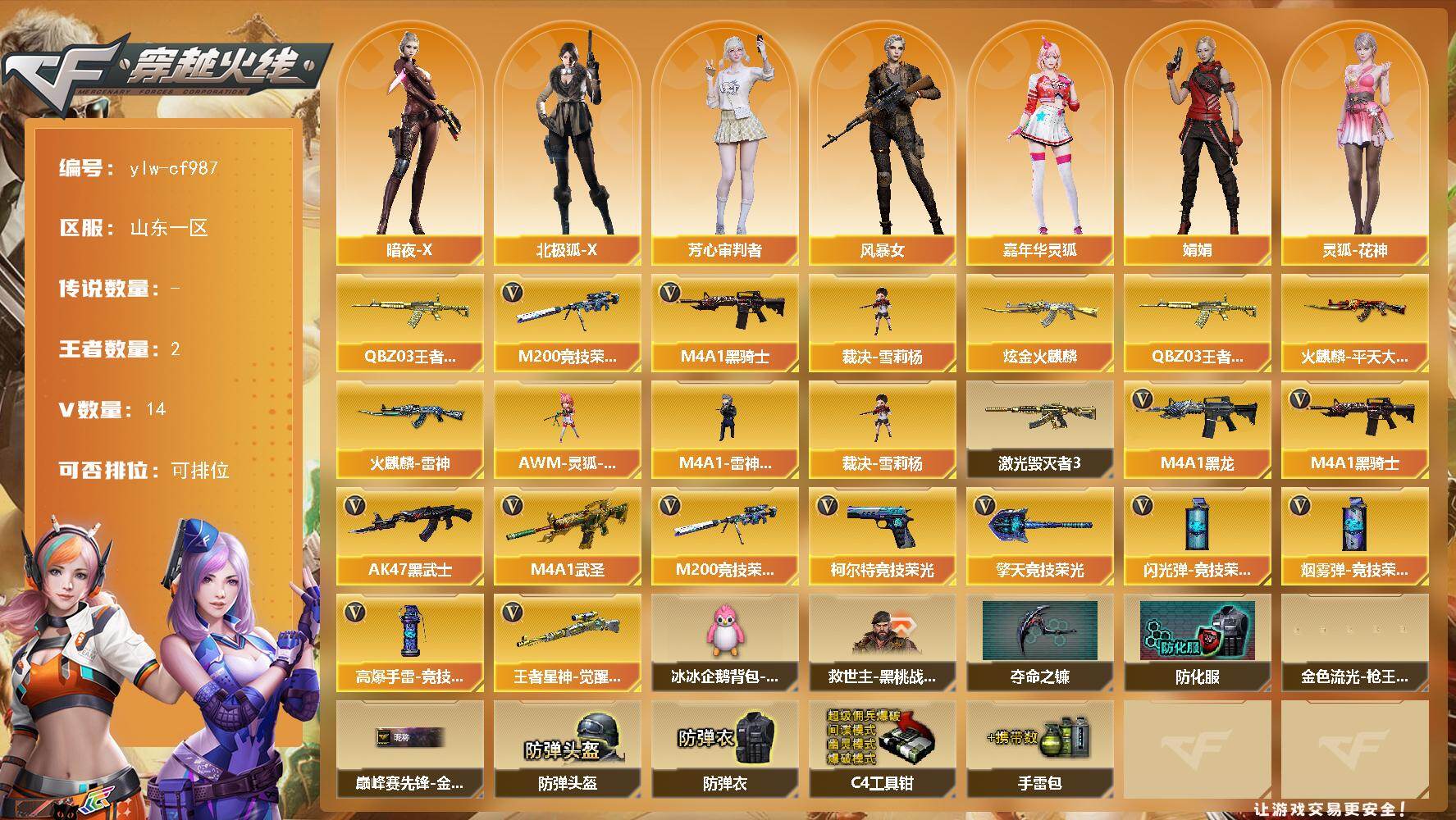 [16228912]山东一区-14V-2王者-1炫金 【热门武器】:QBZ-03-王者蔷薇,M200-竞技荣光,M4A1-黑骑士,裁决-雪莉杨 【王者炫金武器】:QBZ-03-王者蔷薇,炫金火麒麟 【皮肤】:火麒麟-雷神,火麒麟-平天大圣 【角色】:暗夜-X,北极狐-X,芳心审判者,风暴女,嘉年华灵狐,娟娟,灵狐-花神,龙儿,龙儿-小淘气,潘多拉-X 【人偶武器】:裁决-雪莉杨,M4A1-雷神-精英刀锋,AWM-灵狐-15周年嘉年华 【挑战大师】:激光毁灭者III 【英雄级武器】:M4A1-黑龙,M4A1-黑骑士,AK47-黑武士,M4A1-武圣,M200-竞技荣光,王者星神-觉醒版,柯尔特-竞技荣光,擎天-竞技荣光,高爆手雷-竞技荣光*2,闪光弹-竞技荣光*2,烟雾弹-竞技荣光*2 【道具】:冰冰企鹅背包-猛男专用,救世主-黑桃战神,夺命之镰,防化服,金色流光-枪王排位*2,星辰流光-枪王排位,巅峰赛先锋-金色流光,枪王排位28赛季金色流光,防弹头盔,防弹衣*2,C4工具钳,手雷包 【特殊枪械】:1黑骑士