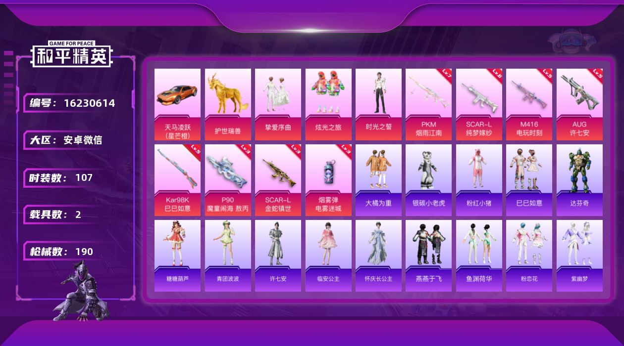 【粉色枪皮等级】:SCAR-L-纯梦嫁纱(六级),SCAR-L-金蛇镇世(三级),M416-电玩时刻(五级),AUG-许七安(五级),P90-魔童闹海 敖丙(三级),Kar98K-巳巳如意(五级),PKM-江南烟雨(七级),烟雾弹-电雾迷城(三级)