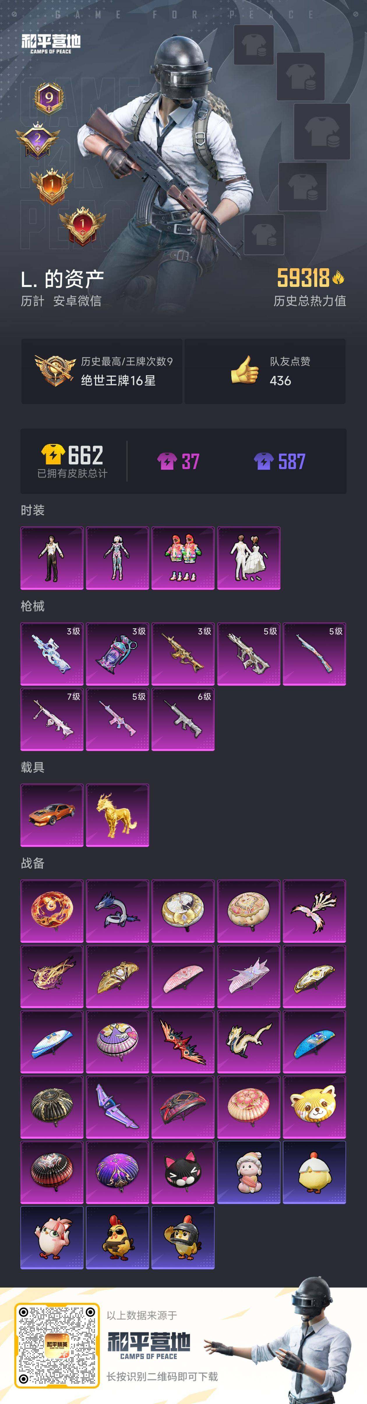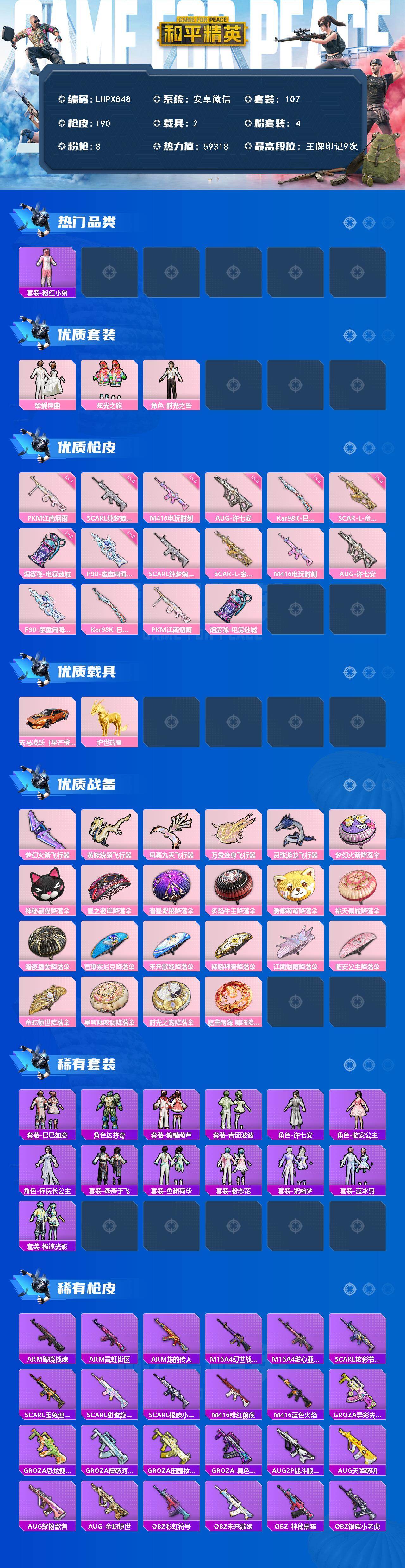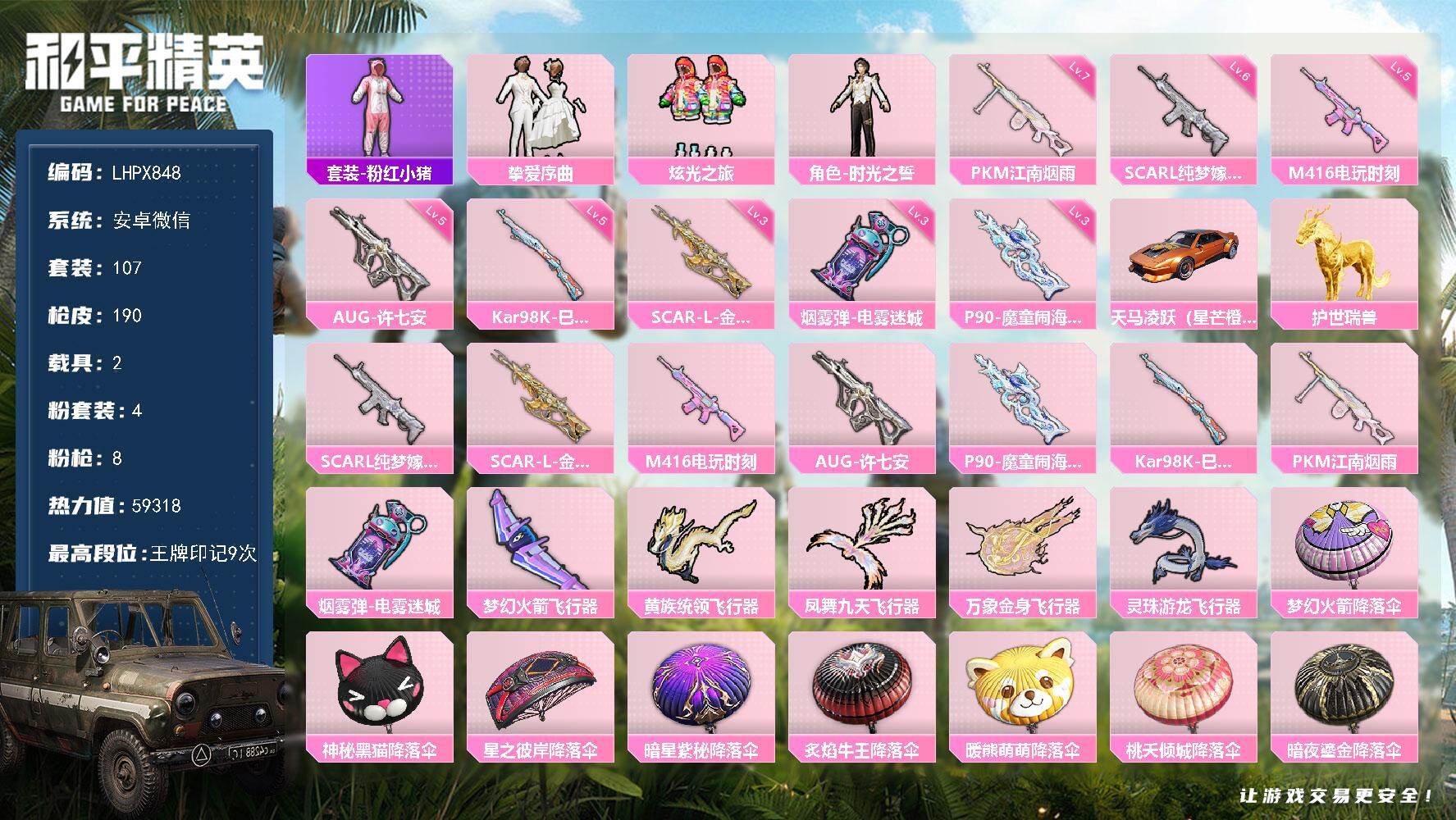 [16230614]【特价出售/店主推荐】安卓 微信-4粉装-8特效枪-2载具-6粉色飞行器-5.9w热力值-9王牌印记-107套装-190枪皮 【热门品类】:套装-粉红小猪 【粉色套装】:粉装-挚爱序曲,粉装-炫光之旅,角色-时光之誓 【粉色枪皮等级】:SCAR-L-纯梦嫁纱(六级),SCAR-L-金蛇镇世(三级),M416-电玩时刻(五级),AUG-许七安(五级),P90-魔童闹海 敖丙(三级),Kar98K-巳巳如意(五级),PKM-江南烟雨(七级),烟雾弹-电雾迷城(三级) 【粉色载具】:天马凌跃(星芒橙),护世瑞兽 【粉色枪皮】:SCAR-L-纯梦嫁纱,SCAR-L-金蛇镇世,M416-电玩时刻,AUG-许七安,P90-魔童闹海 敖丙,Kar98K-巳巳如意,PKM-江南烟雨,烟雾弹-电雾迷城 【粉色飞行器】:梦幻火箭飞行器,黄族统领飞行器,凤舞九天飞行器,万象金身飞行器,灵珠游龙飞行器 【粉色降落伞】:梦幻火箭降落伞,神秘黑猫降落伞,星之彼岸降落伞,暗星紫秘降落伞,炙焰牛王降落伞,暖熊萌萌降落伞,桃夭倾城降落伞,暗夜鎏金降落伞,音爆索尼克降落伞,未来歌姬降落伞,拂晓神骑降落伞,江南烟雨降落伞,临安公主降落伞,金蛇镇世降落伞,星穹咏叹调降落伞,时光之吻降落伞,魔童闹海 哪吒降落伞 【稀有套装】:套装-巳巳如意,角色-达芬奇,套装-糖糖葫芦,套装-青团波波,角色-许七安,角色-临安公主,角色-怀庆长公主,套装-燕燕于飞,套装-鱼渊荷华,套装-粉恋花,套装-紫幽梦,套装-蓝冰羽,套装-极速光影 【稀有枪皮】:AKM-破晓战魂,AKM-霓虹街区,AKM-龙的传人,M16A4-幻世战舞者,M16A4-甜心亚梦,SCAR-L-炫彩节奏,SCAR-L-玉兔迎春,SCAR-L-甜蜜旋律,SCAR-L-银碳小老虎,M416-绯红前夜,M416-蓝色火焰,GROZA-异彩先驱,GROZA-恐龙拽拽,GROZA-懵萌河马,GROZA-田园牧歌,GROZA-黑色刀锋,AUG-2P战斗服款,AUG-天降萌叽,AUG-耀粉歌者,AUG-金蛇镇世,QBZ-彩虹符号,QBZ-未来歌姬,QBZ-神秘黑猫,QBZ-银碳小老虎,QBZ-飞驰魅影,M762-天降萌叽,M762-绯红前夜,M762-镭射皇者,Mk47-妙红点点,G36C-懵萌河马,AC-VAL-甜心亚梦,蜜獾-天降萌叽,蜜獾-娇憨猪猪,蜜獾-桃夭