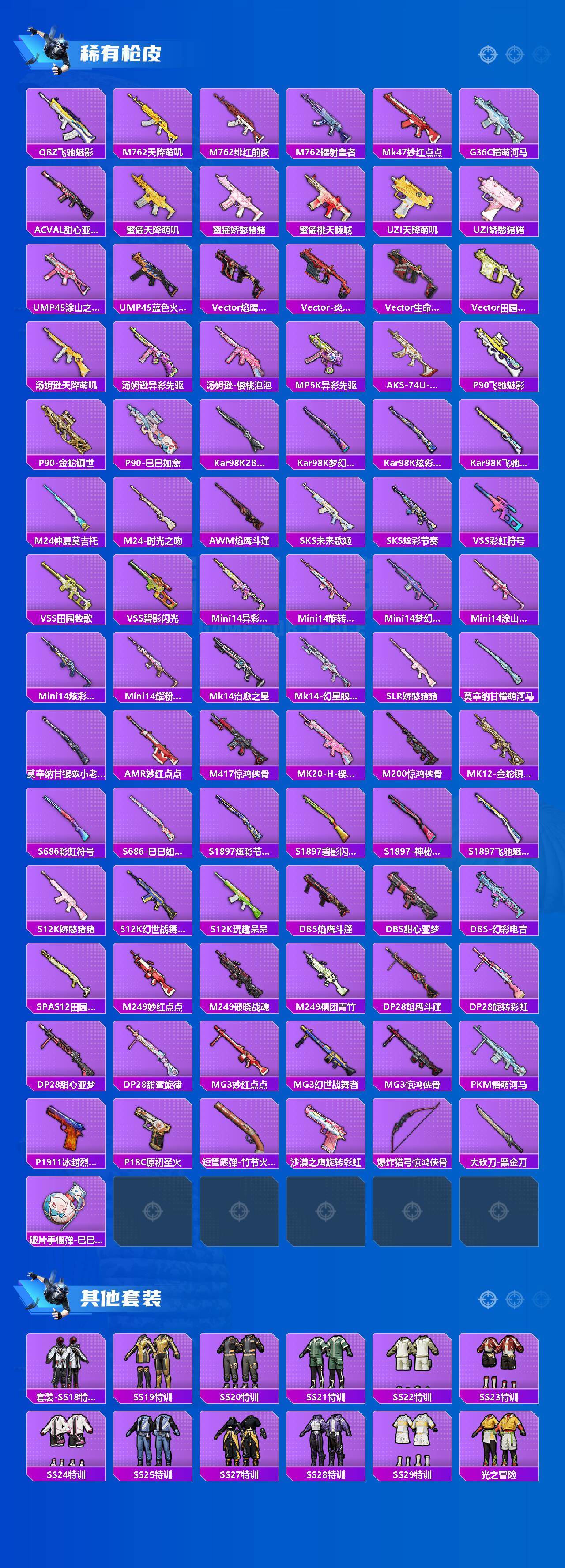 【稀有枪皮】:AKM-破晓战魂,AKM-霓虹街区,AKM-龙的传人,M16A4-幻世战舞者,M16A4-甜心亚梦,SCAR-L-炫彩节奏,SCAR-L-玉兔迎春,SCAR-L-甜蜜旋律,SCAR-L-银碳小老虎,M416-绯红前夜,M416-蓝色火焰,GROZA-异彩先驱,GROZA-恐龙拽拽,GROZA-懵萌河马,GROZA-田园牧歌,GROZA-黑色刀锋,AUG-2P战斗服款,AUG-天降萌叽,AUG-耀粉歌者,AUG-金蛇镇世,QBZ-彩虹符号,QBZ-未来歌姬,QBZ-神秘黑猫,QBZ-银碳小老虎,QBZ-飞驰魅影,M762-天降萌叽,M762-绯红前夜,M762-镭射皇者,Mk47-妙红点点,G36C-懵萌河马,AC-VAL-甜心亚梦,蜜獾-天降萌叽,蜜獾-娇憨猪猪,蜜獾-桃夭