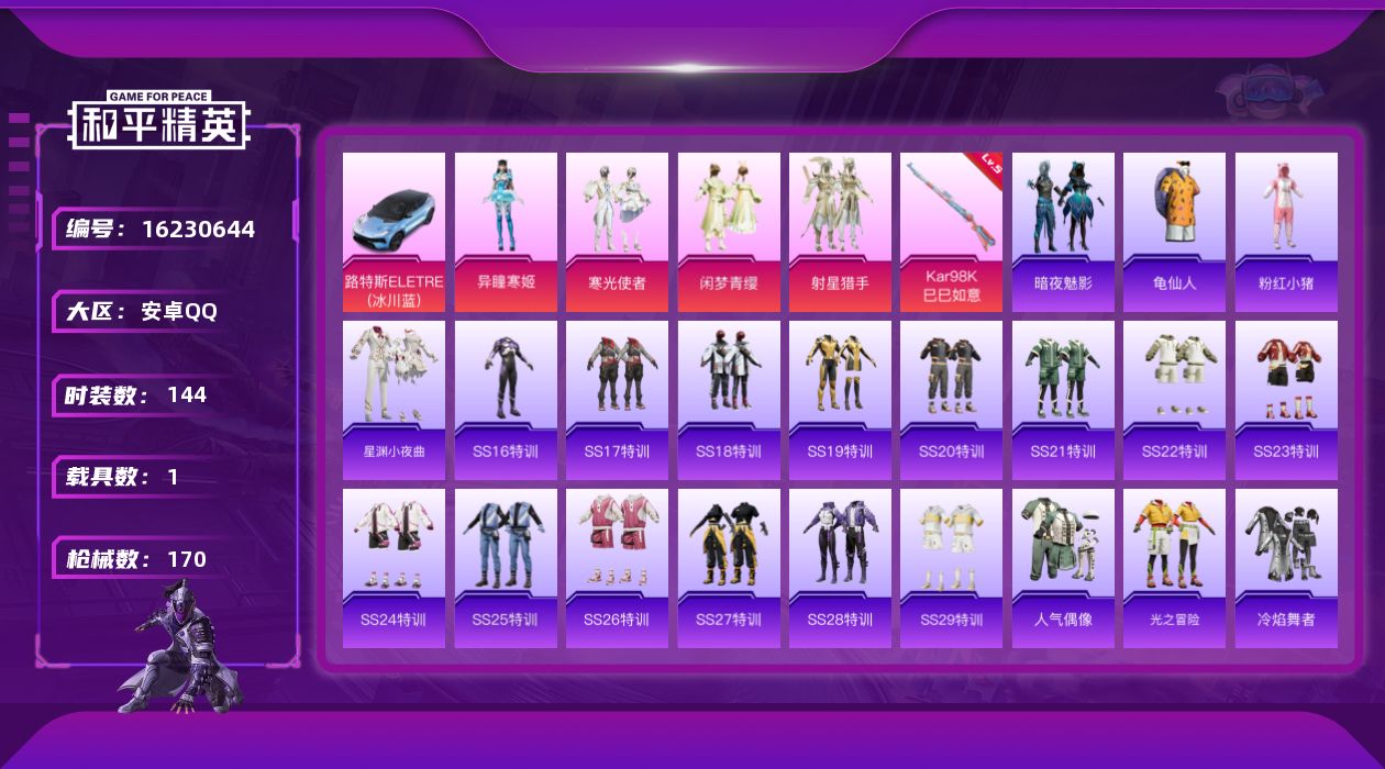 [16230644]【特价出售/店主推荐】安卓 手Q-4粉装-1特效枪-1载具-0粉色飞行器-53035热力值-16王牌印记-144套装-170枪皮 【热门品类】:套装-龟仙人,套装-粉红小猪 【粉色套装】:粉装-寒光使者,粉装-闲梦青缨,粉装-射星猎手,角色-异瞳寒姬 【粉色枪皮等级】:Kar98K-巳巳如意(五级) 【粉色载具】:路特斯ELETRE(冰川蓝) 【粉色枪皮】:Kar98K-巳巳如意 【粉色降落伞】:暗夜玫瑰降落伞,洛神天依降落伞,暗星紫秘降落伞,冷魅冰骑降落伞,飒粉甜心降落伞,闲梦青缨降落伞,圣堂之誓降落伞,精灵梦叶罗丽降落伞 【稀有套装】:套装-龟仙人,套装-星渊小夜曲 【稀有枪皮】:AKM-彩虹符号,AKM-破晓战魂,AKM-萌趣颜团子,AKM-虎虎生威,AKM-霓虹街区,AKM-龙的传人,M16A4-幻世战舞者,M16A4-甜心亚梦,M16A4-红色方程式,SCAR-L-炫彩节奏,SCAR-L-玉兔迎春,SCAR-L-红色方程式,M416-夜灯,M416-糯团青竹,M416-红色方程式,M416-蓝色火焰,GROZA-异彩先驱,GROZA-彩虹符号,GROZA-恐龙拽拽,GROZA-林间仙鹿,GROZA-田园牧歌,AUG-天降萌叽,AUG-耀粉歌者,QBZ-绚金瑰梦,QBZ-飞驰魅影,M762-天降萌叽,M762-暗夜鎏金,M762-瑞龙福将,M762-第五大道,Mk47-妙红点点,Mk47-洛神天依,G36C-炙焰牛王,G36C-星穹咏叹调,AC-VAL-天降萌叽,AC-VAL-快闪甜心,AC-VAL-甜心亚梦,蜜獾-千面幻镜,蜜獾-垂柳戏鸭,蜜獾-天降萌叽,蜜獾-娇憨猪猪,UZI-啾咪啾咪,UZI-天降萌叽,UZI-娇憨猪猪,UZI-炫彩节奏,UZI-红色方程式,UMP45-仲夏莫吉托,UMP45-海渊国主,UMP45-涂山之恋,UMP45-生命誓言,Vector-生命誓言,Vector-田园牧歌,汤姆逊-奇异狩猎者,汤姆逊-庄周梦蝶,汤姆逊-异彩先驱,汤姆逊-炫彩节奏,汤姆逊-耀粉歌者,野牛-夜灯,MP5K-异彩先驱,P90-快闪甜心,P90-飞驰魅影,Kar98K-洛神天依,Kar98K-炫彩节奏,Kar98K-王子的夏天,Kar98K-红色方程式,Kar98K-飞驰魅影,M24-炫彩节奏,AWM-圣堂之誓,SKS-天之羽翼,SKS-炫彩节奏,SKS-