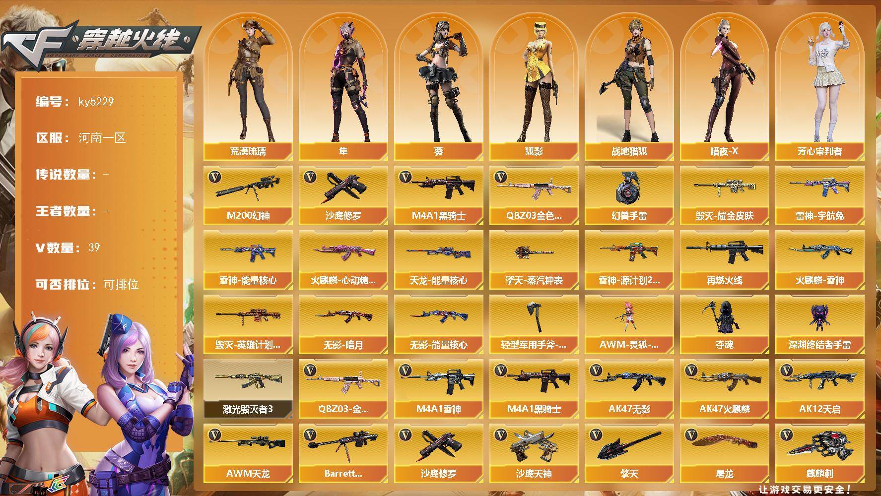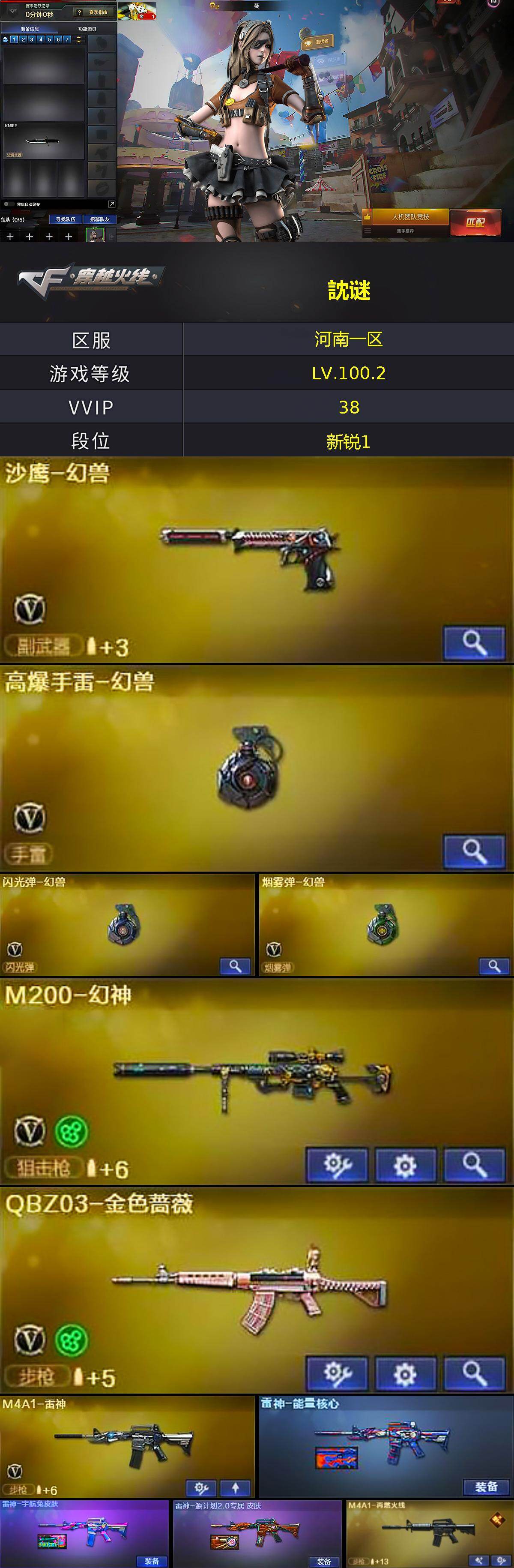 [16230924]河南一区-39V-0王者-0炫金 【热门武器】:QBZ03-金色蔷薇,M200-幻神,M4A1-黑骑士,沙鹰-修罗*3,高爆手雷-幻兽 【皮肤】:雷神-能量核心,雷神-宇航兔皮肤,雷神-源计划2.0专属 皮肤,M4A1-再燃火线,火麒麟-雷神,火麒麟-心动糖果,毁灭耀金皮肤,毁灭-英雄计划 皮肤,无影-暗月,无影-能量核心,天龙-能量核心,轻型军用手斧-再燃火线,擎天-蒸汽钟表 皮肤 【角色】:葵,荒漠琉璃,隼,战地猎狐,狐影,暗夜-X,芳心审判者,飞虎队-X,风暴女,嘉年华灵狐,猎狐者-追月,灵狐者-X,玫瑰花神,潘多拉-X,潘多拉-甜心教官,斯沃特-X,兔囡囡,樱-战斗天使,影武者-X,游珑儿,智影 【人偶武器】:AWM-灵狐-15周年嘉年华,夺魂,深渊终结者手雷 【挑战大师】:激光毁灭者III 【英雄级武器】:AK47-火麒麟,M4A1-雷神,M4A1-黑骑士,AK47-无影,AK12-天启,AK47-黑鲨,无影-神兵利器,黑武士-锦绣游龙,QBZ03-金色蔷薇,AK-47-猩红传说,AWM-天龙,Barrett-毁灭,M200-幻神,沙鹰-修罗*3,沙鹰-天神,沙鹰-幻兽,屠龙*2,擎天,麒麟刺,女皇利刃-幻兽,高爆手雷-幻兽,闪光弹-幻兽,闪光弹-幻灵,闪光弹-云龙*2,烟雾弹-幻兽,M4A1-赤狱骑士 【道具】:BS战队炫彩背包,CFS限定背包,亚洲杯纪念炫彩背包,战舰背包,炫彩背包,百战金芒炫彩背包,超级背包,哔哩哔哩名片,女皇终结者-魔龙之吻,救世主-黑桃战神,绿色巨人,灵魂忍者,迷雾幽灵,夺命之镰,防化服*3,金色流光-枪王排位*2,星辰流光-枪王排位,巅峰赛先锋-金色流光,流光-再燃火线,枪王排位28赛季金色流光,枪王排位29赛季金色流光,云海游龙表情,EP战队名片,EP战队喷图,C4-再燃火线,防弹头盔*4,防弹衣*4,C4工具钳*4,手雷包*4 【特殊枪械】:1黑骑士