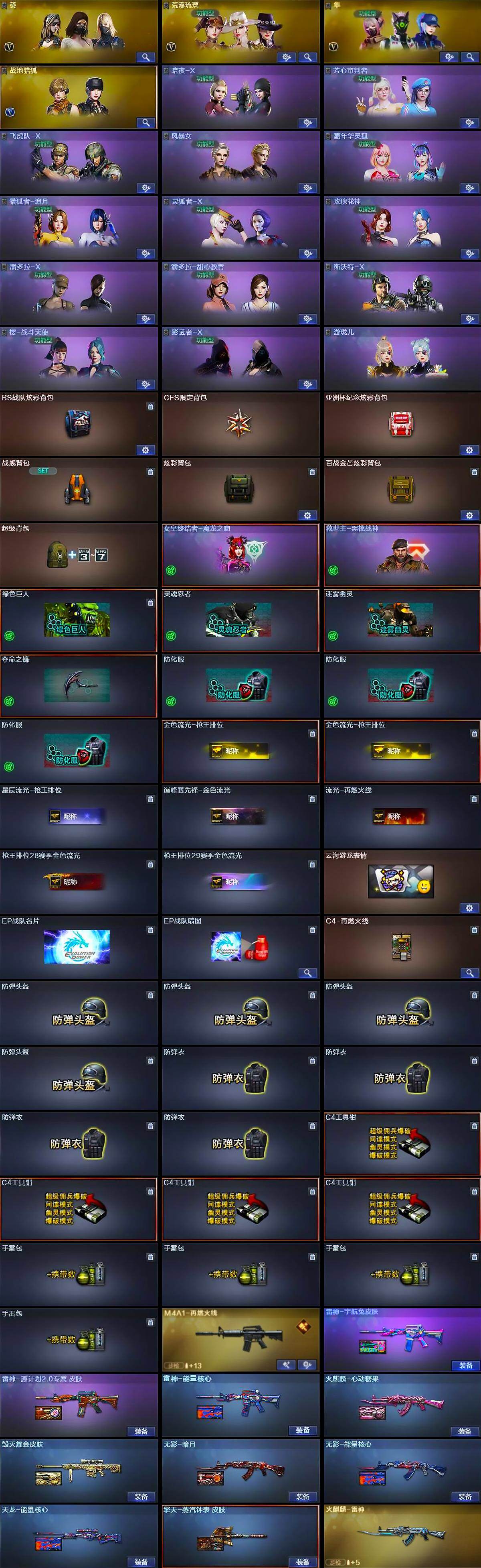 【道具】:BS战队炫彩背包,CFS限定背包,亚洲杯纪念炫彩背包,战舰背包,炫彩背包,百战金芒炫彩背包,超级背包,哔哩哔哩名片,女皇终结者-魔龙之吻,救世主-黑桃战神,绿色巨人,灵魂忍者,迷雾幽灵,夺命之镰,防化服*3,金色流光-枪王排位*2,星辰流光-枪王排位,巅峰赛先锋-金色流光,流光-再燃火线,枪王排位28赛季金色流光,枪王排位29赛季金色流光,云海游龙表情,EP战队名片,EP战队喷图,C4-再燃火线,防弹头盔*4,防弹衣*4,C4工具钳*4,手雷包*4