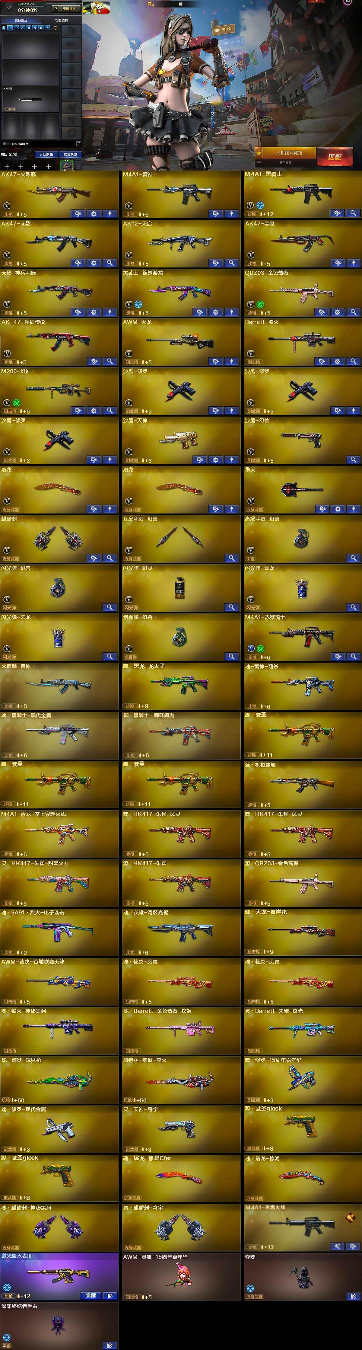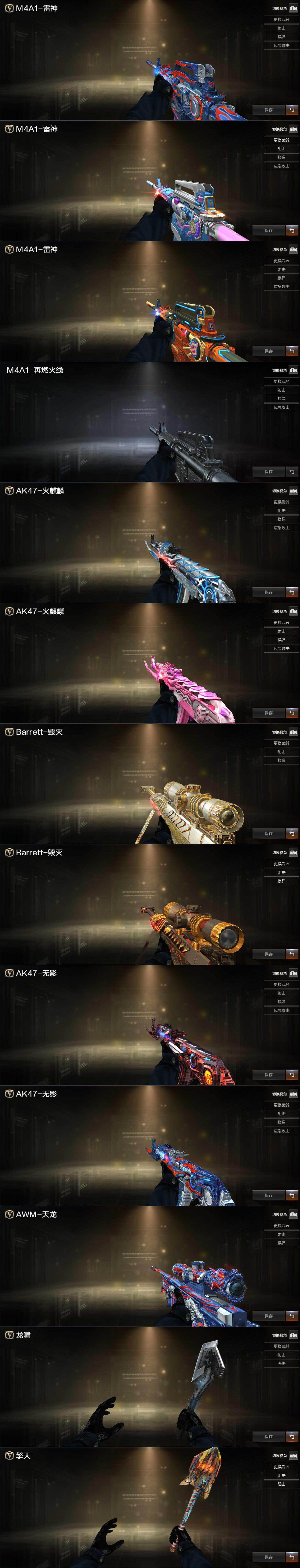 【英雄级武器】:AK47-火麒麟,M4A1-雷神,M4A1-黑骑士,AK47-无影,AK12-天启,AK47-黑鲨,无影-神兵利器,黑武士-锦绣游龙,QBZ03-金色蔷薇,AK-47-猩红传说,AWM-天龙,Barrett-毁灭,M200-幻神,沙鹰-修罗*3,沙鹰-天神,沙鹰-幻兽,屠龙*2,擎天,麒麟刺,女皇利刃-幻兽,高爆手雷-幻兽,闪光弹-幻兽,闪光弹-幻灵,闪光弹-云龙*2,烟雾弹-幻兽,M4A1-赤狱骑士
