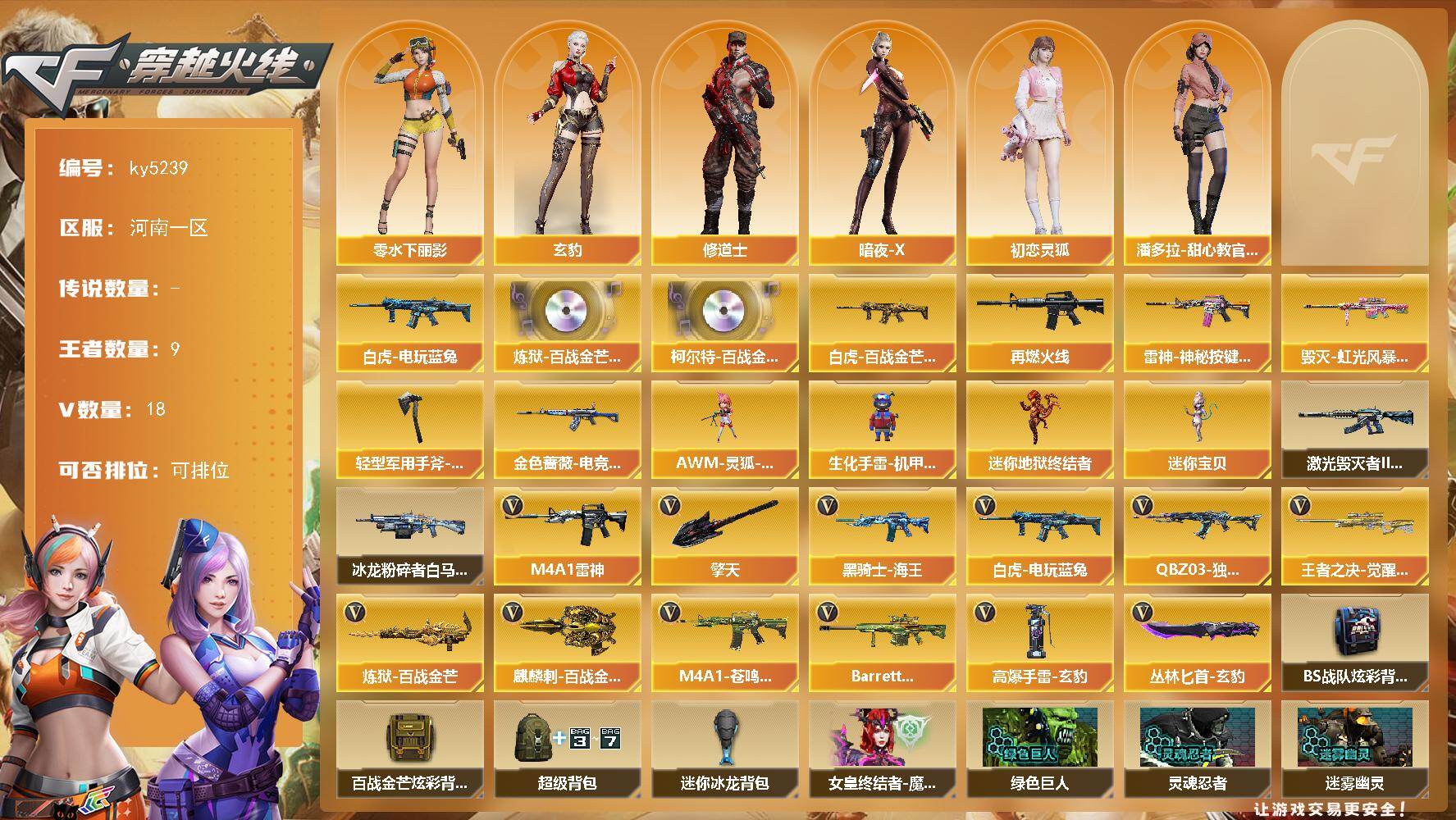 [16231670]河南一区-18V-9王者-0炫金 【热门武器】:白虎-电玩蓝兔 【音效卡】:炼狱-百战金芒-庆典舞曲音效卡,柯尔特-百战金芒-庆典舞曲音效卡 【皮肤】:白虎-百战金芒 皮肤,金色蔷薇-电竞之星 皮肤,M4A1-再燃火线,雷神-神秘按键 皮肤,毁灭-虹光风暴 皮肤,轻型军用手斧-再燃火线 【角色】:玄豹,修道士,暗夜-X,初恋灵狐,零-水下丽影,潘多拉-甜心教官 【人偶武器】:迷你宝贝,迷你地狱终结者,AWM-灵狐-15周年嘉年华*2,生化手雷-机甲核心 【挑战大师】:冰龙粉碎者-白马银枪,激光毁灭者III-白马银枪 【英雄级武器】:M4A1-雷神,QBZ03-独角-IV,黑骑士-海王,白虎-电玩蓝兔,王者之决-觉醒版,炼狱-百战金芒,擎天,麒麟刺-百战金芒,丛林匕首-玄豹,高爆手雷-玄豹,M4A1-苍鸣雷神,Barrett-碧霄极光 【道具】:BS战队炫彩背包,百战金芒炫彩背包,超级背包,迷你冰龙背包,女皇终结者-魔龙之吻,绿色巨人,灵魂忍者,迷雾幽灵,夺命之镰,防化服*3,语音特效-盛典烟火,萌萌小葵表情,防弹头盔,防弹衣,C4工具钳,手雷包 【特殊枪械】: