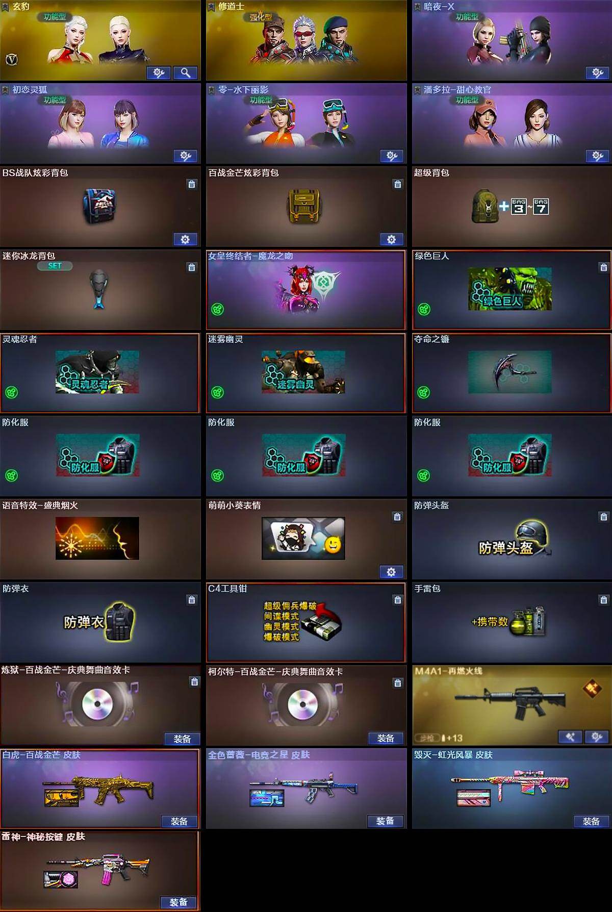【道具】:BS战队炫彩背包,百战金芒炫彩背包,超级背包,迷你冰龙背包,女皇终结者-魔龙之吻,绿色巨人,灵魂忍者,迷雾幽灵,夺命之镰,防化服*3,语音特效-盛典烟火,萌萌小葵表情,防弹头盔,防弹衣,C4工具钳,手雷包