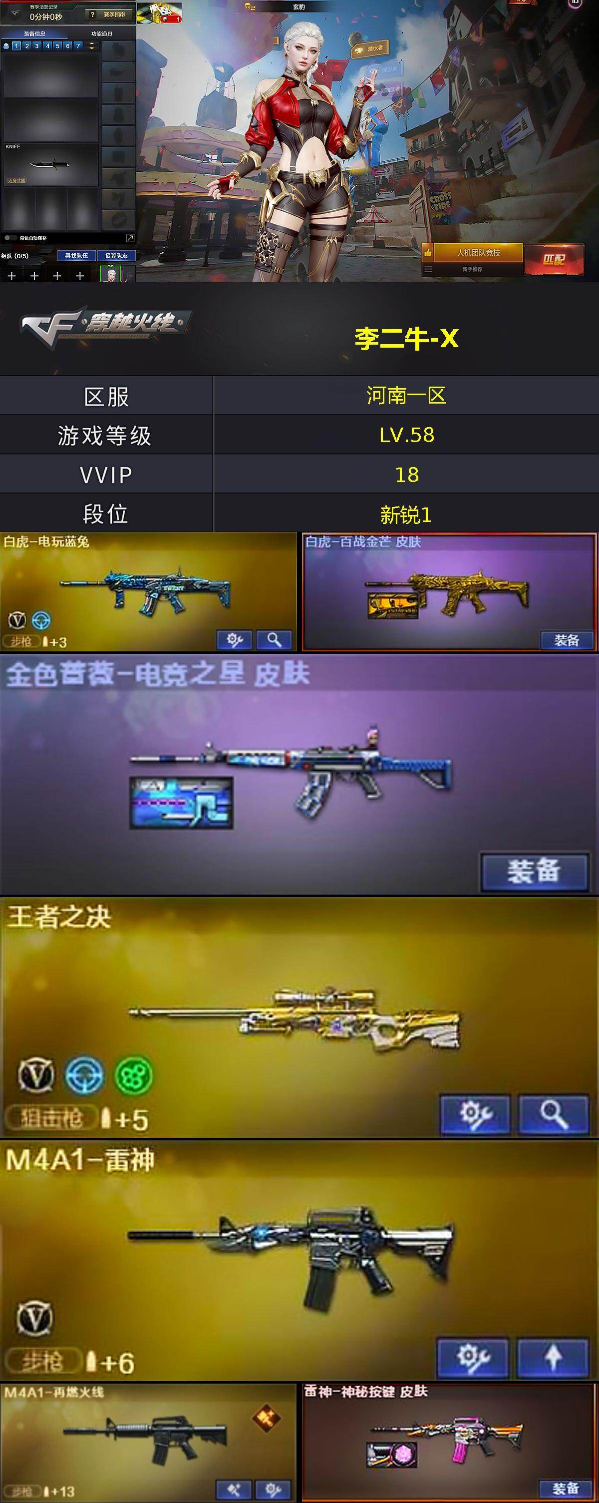 [16231693]河南一区-18V-9王者-0炫金 【热门武器】:白虎-电玩蓝兔 【音效卡】:炼狱-百战金芒-庆典舞曲音效卡,柯尔特-百战金芒-庆典舞曲音效卡 【皮肤】:白虎-百战金芒 皮肤,金色蔷薇-电竞之星 皮肤,M4A1-再燃火线,雷神-神秘按键 皮肤,毁灭-虹光风暴 皮肤,轻型军用手斧-再燃火线 【角色】:玄豹,修道士,暗夜-X,初恋灵狐,零-水下丽影,潘多拉-甜心教官 【人偶武器】:迷你宝贝,迷你地狱终结者,AWM-灵狐-15周年嘉年华*2,生化手雷-机甲核心 【挑战大师】:冰龙粉碎者-白马银枪,激光毁灭者III-白马银枪 【英雄级武器】:M4A1-雷神,QBZ03-独角-IV,黑骑士-海王,白虎-电玩蓝兔,王者之决-觉醒版,炼狱-百战金芒,擎天,麒麟刺-百战金芒,丛林匕首-玄豹,高爆手雷-玄豹,M4A1-苍鸣雷神,Barrett-碧霄极光 【道具】:BS战队炫彩背包,百战金芒炫彩背包,超级背包,迷你冰龙背包,女皇终结者-魔龙之吻,绿色巨人,灵魂忍者,迷雾幽灵,夺命之镰,防化服*3,语音特效-盛典烟火,萌萌小葵表情,防弹头盔,防弹衣,C4工具钳,手雷包 【特殊枪械】: