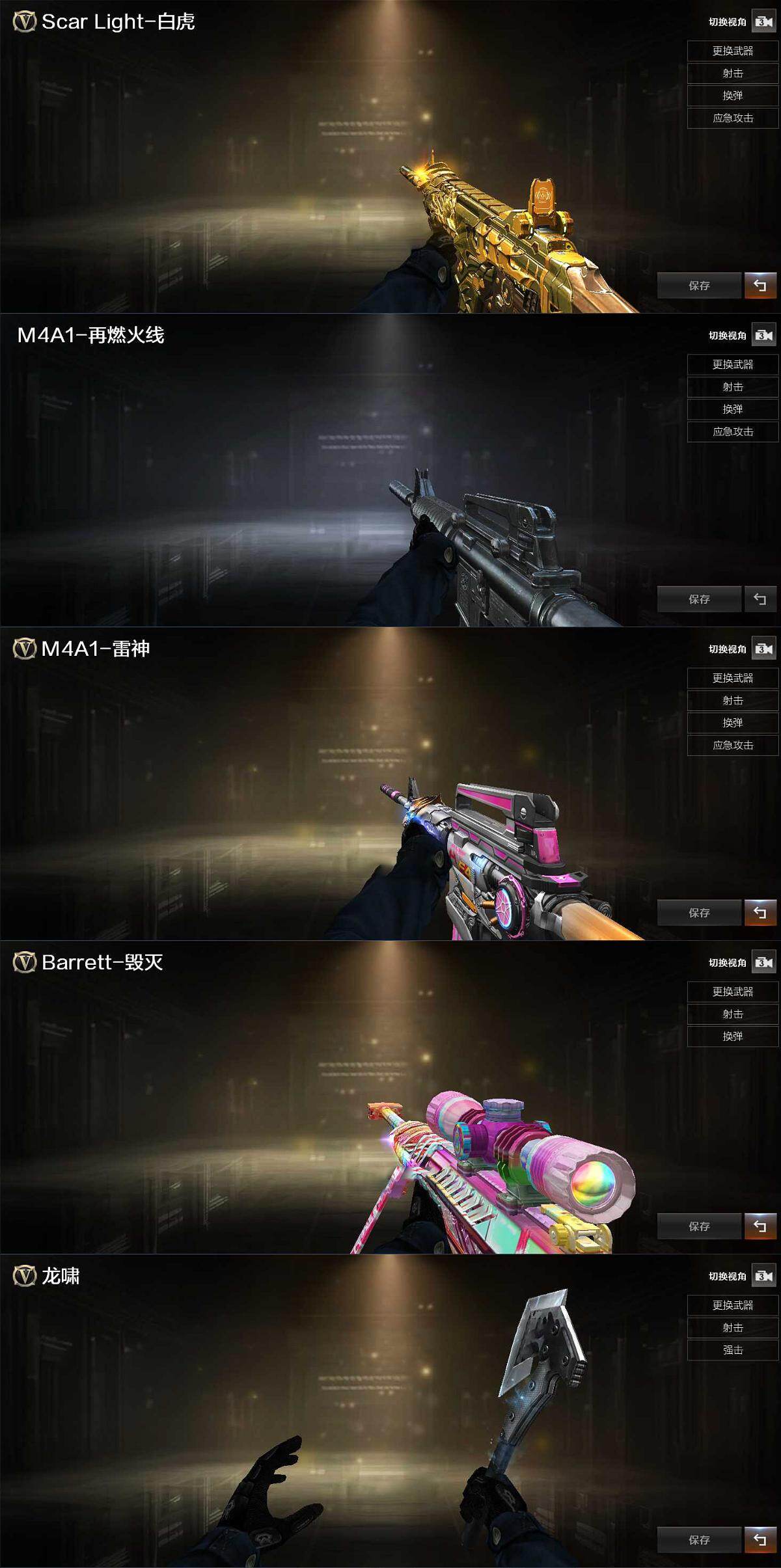【皮肤】:白虎-百战金芒 皮肤,金色蔷薇-电竞之星 皮肤,M4A1-再燃火线,雷神-神秘按键 皮肤,毁灭-虹光风暴 皮肤,轻型军用手斧-再燃火线