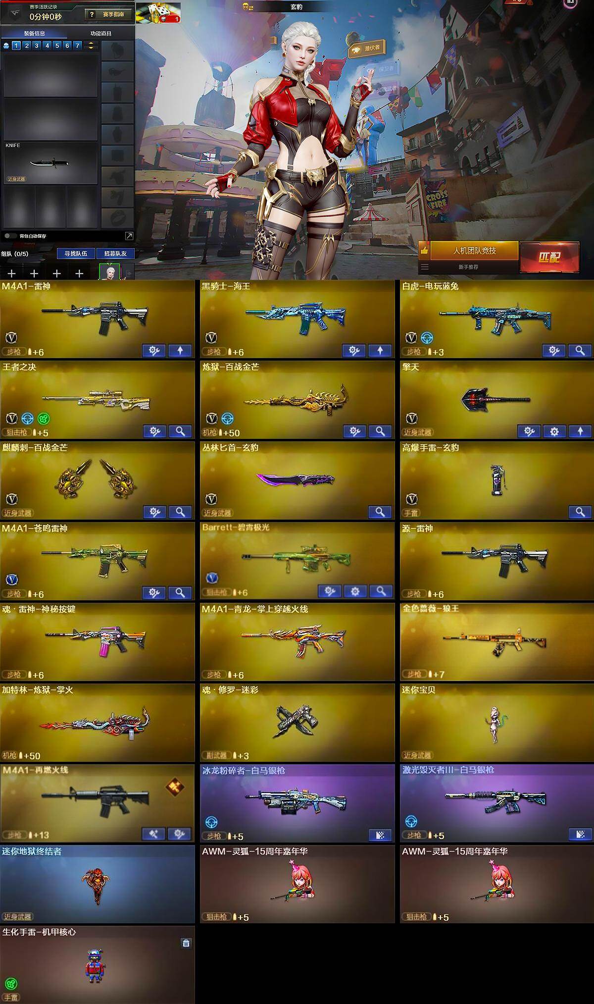【英雄级武器】:M4A1-雷神,QBZ03-独角-IV,黑骑士-海王,白虎-电玩蓝兔,王者之决-觉醒版,炼狱-百战金芒,擎天,麒麟刺-百战金芒,丛林匕首-玄豹,高爆手雷-玄豹,M4A1-苍鸣雷神,Barrett-碧霄极光