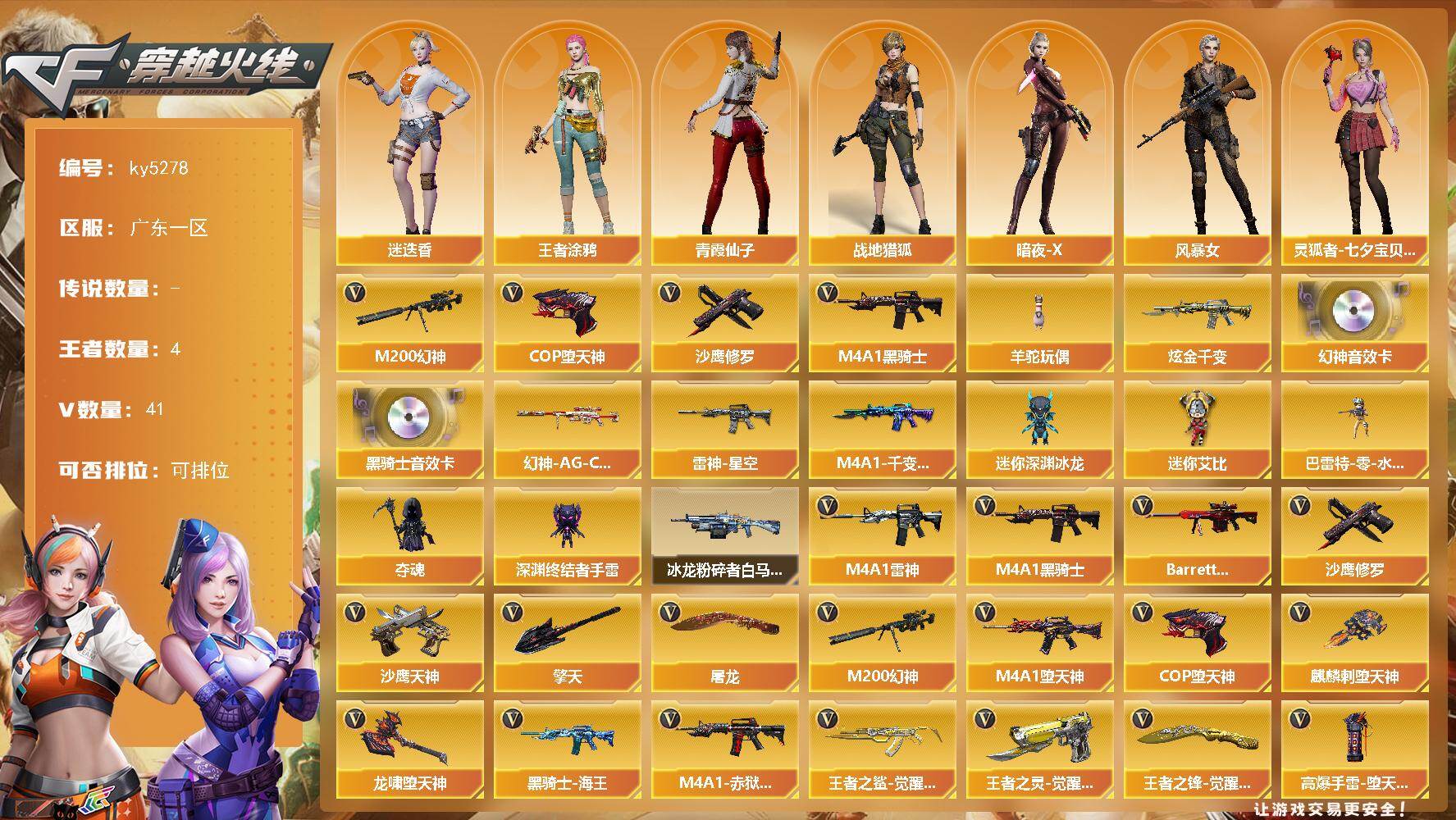 [16235577]广东一区-41V-4王者-1炫金 【热门武器】:M200-幻神,M4A1-黑骑士,羊驼玩偶,COP-堕天神,沙鹰-修罗 【王者炫金武器】:炫金千变 【音效卡】:M200-幻神音效卡,M4A1-黑骑士音效卡 【皮肤】:幻神-AG-CFPL S24冠军 皮肤,雷神-星空,M4A1-千变-孔明皮肤 【角色】:迷迭香,战地猎狐,王者涂鸦,暗夜-X,风暴女,灵狐者-七夕宝贝,龙儿-小淘气,潘多拉-X,潘多拉-甜心教官,潜龙队-X,青霞仙子,莎莎,新娜塔莎,影武者-X 【人偶武器】:巴雷特-零-水下丽影,迷你深渊冰龙,夺魂,深渊终结者手雷,迷你艾比 【挑战大师】:冰龙粉碎者-白马银枪 【英雄级武器】:M4A1-雷神,M4A1-黑骑士,M4A1-堕天神,王者之鲨-觉醒版,黑骑士-海王,Barrett-极光,M200-幻神,沙鹰-修罗,沙鹰-天神*4,COP-堕天神,王者之灵-觉醒版,屠龙,麒麟刺-堕天神*2,擎天,龙啸-堕天神*2,王者之锋-觉醒版,高爆手雷-堕天神*7,闪光弹-堕天神*7,烟雾弹-堕天神*7,M4A1-赤狱骑士 【道具】:炫彩背包-诺拉,炫彩背包,超级背包,救世主-黑桃战神,绿色巨人,灵魂忍者*2,迷雾幽灵,夺命之镰,防化服*2,流光-再燃火线,C4-再燃火线,防弹头盔*3,防弹衣*3,C4工具钳*3,手雷包*3 【特殊枪械】:1黑骑士