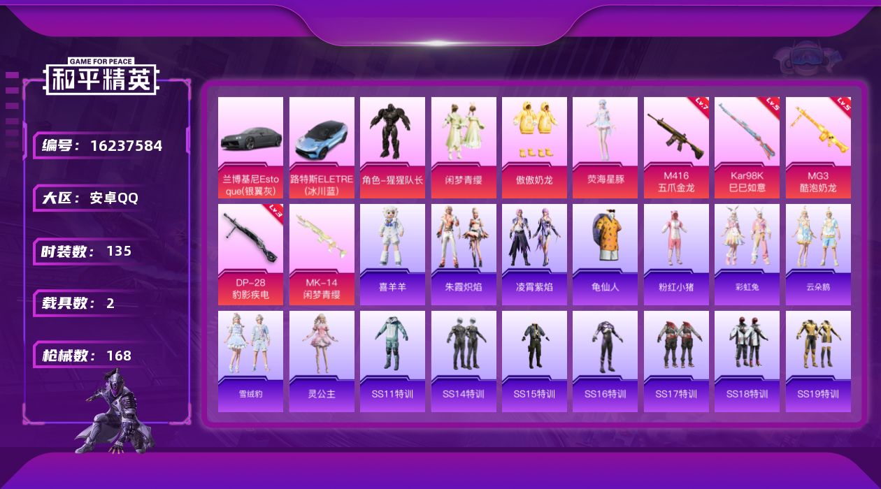 [16237584]【店主推荐捡漏号】安卓 手Q-4粉装-5特效枪-2载具-2粉色飞行器-56673热力值-11王牌印记-135套装-168枪皮【热门品类】:套装-龟仙人,套装-粉红小猪【粉色套装】:角色-猩猩队长,粉装-闲梦青缨,粉装-傲傲奶龙,角色-荧海星豚【粉色枪皮等级】:M416-五爪金龙(七级),Kar98K-巳巳如意(五级),DP-28-豹影疾电(三级),MG3-酷泡奶龙(五级)【粉色载具】:兰博基尼Estoque(银翼灰),路特斯ELETRE(冰川蓝)【粉色枪皮】:M416-五爪金龙,Kar98K-巳巳如意,Mk14-闲梦青缨,DP-28-豹影疾电,MG3-酷泡奶龙