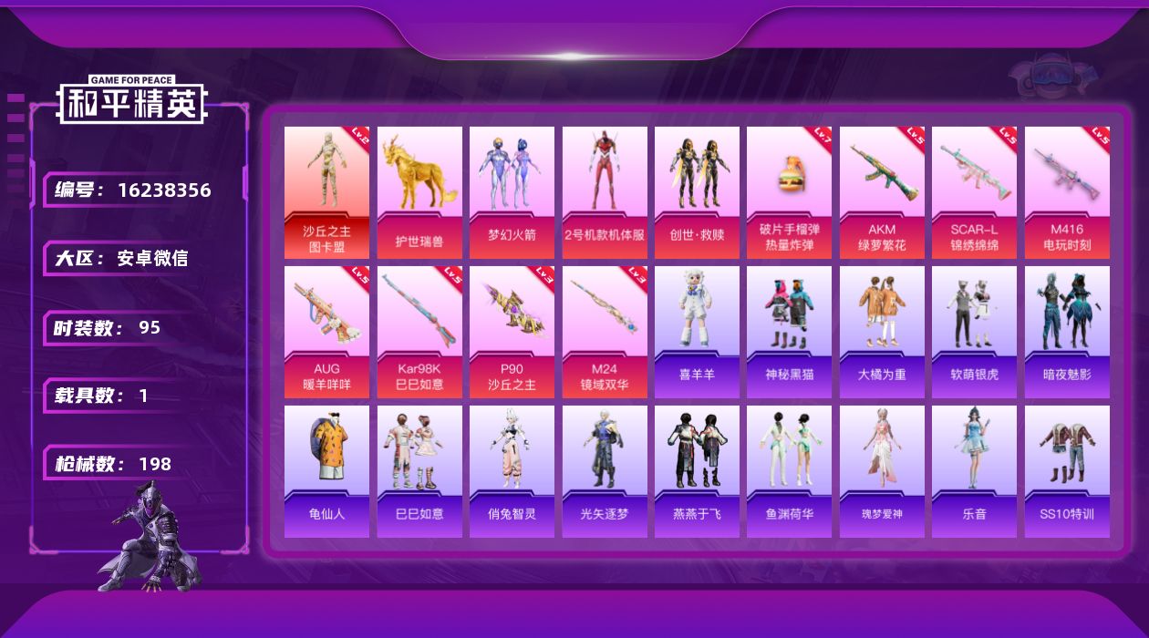 [16238356]安卓 微信-1神装-3粉装-8特效枪-1载具-10粉色飞行器-55785热力值-8王牌印记-95套装-198枪皮