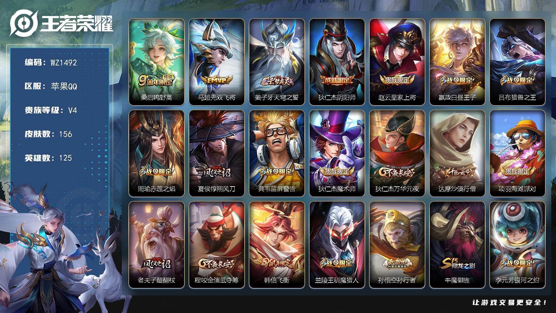 - [17001839]苹果WX-128279积分!对抗55段!打野41段!11金标!V9-129英雄-386皮肤-1典藏皮肤-1典藏英雄-1珍品无双-2珍品传说-27传说-112史诗-1星元 【英雄全皮】:达摩全皮,孙权全皮,橘右京全皮,猪八戒全皮,敖隐全皮,蒙恬全皮,夏洛特全皮,司空震全皮,影全皮 【荣耀典藏】:武则天英雄,花木兰九霄神辉 【珍品无双】:貂蝉馥梦繁花 【珍品传说】:马可波罗怪盗基德,嫦娥器灵落星盏 【传说皮肤】:西施续相思,杨玉环星之鸣奏,司空震愿照山河定,女娲愿照千秋盛,妲己愿照众生和,澜愿照九州拓,蔡文姬愿照福禄聚,虞姬愿照岁时盈,亚连落雪白狼,澜逐花归海,夏洛特浮生妄,小乔山海琳琅生,曜山海苍雷引,李信山海炽霜斩,李白诗剑行,橘右京枫霜尽,马超无双飞将,裴擒虎寅虎赤拳,孙尚香异界灵契,镜炽阳神光,虞姬启明星使,曜云鹰飞将,干将莫邪久胜战神,达摩黄金狮子座,杨戬永曜之星,宫本武藏地狱之眼,狄仁杰超时空战士 【限定皮肤】:大乔绒语心约,姜子牙天穹之誓,狄仁杰阴阳师,小乔山海琳琅生,赵云皇家上将,墨子神迹守卫,孙尚香异界灵契,庄周高山流水,高渐离玩趣恶龙,钟无艳超时空战士,扁鹊奇幻香踪,白起夜都怪侠,芈月白晶晶,芈月幻夜卜梦,吕布御风骁将,元歌云间偶戏,元歌无心,甄姬女儿国国王,甄姬落雪兰心,马可波罗暗影游猎,马可波罗山海玄木吟,狄仁杰魔术师,狄仁杰万华元夜,达摩星际陆战队,达摩沙漠行僧,项羽海滩派对,老夫子醍醐杖,老夫子航海奇遇记,关羽冰锋战神,程咬金演武夺筹,王昭君午后时光,兰陵王金庭之子,花木兰青春决赛季,花木兰默契交锋,橘右京枫霜尽,亚瑟潮玩骑士王,孙悟空至尊宝,孙悟空孙行者,后羿圣弓游侠,张飞虎魄,李元芳银河之约,李元芳云中旅人,虞姬启明星使,钟馗驱傩正仪,杨玉环寅虎心曲,杨戬永曜之星,杨戬潮玩骑兵,女娲朔望之晖,干将莫邪真爱魔法,雅典娜黎明之约,蔡文姬繁星吟游,鬼谷子原初探秘者,鬼谷子五谷丰年,黄忠火炮绅士,苏烈千军破阵,百里玄策原初追逐者,弈星混沌棋,梦奇顽趣,沈梦溪星空之诺,沈梦溪大漠名商,明世隐疑决卦,明世隐吟游魔法,裴擒虎天狼狩猎者,裴擒虎李小龙,裴擒虎寅虎赤拳,裴擒虎擒涛扼浪,狂铁电玩高手,米莱狄胡桃异想国,瑶山海碧波行,云中君纤云弄巧,李信山海炽霜斩,猪八戒西部大镖客,猪八戒猪悟能,嫦娥拒霜思,嫦娥暖冬兔眠,曜山海苍雷引,西施玲珑珍味,鲁班大师