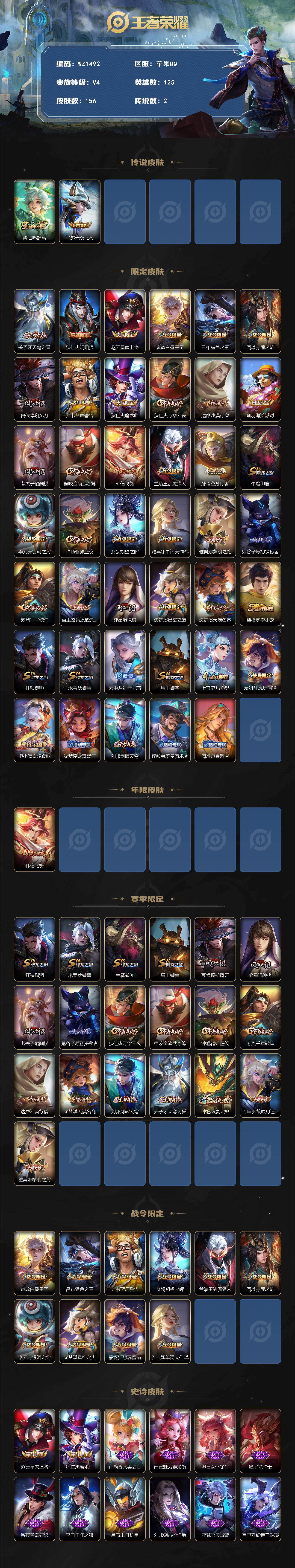 [16239751]苹果Q-156皮肤-2传说-31史诗 【传说皮肤】:桑启鸣野蒿,马超无双飞将 【限定皮肤】:姜子牙天穹之誓,狄仁杰阴阳师,赵云皇家上将,嬴政白昼王子,吕布猎兽之王,周瑜赤莲之焰,夏侯惇朔风刀,典韦蓝屏警告,狄仁杰魔术师,狄仁杰万华元夜,达摩沙漠行僧,项羽海滩派对,老夫子醍醐杖,程咬金演武夺筹,韩信飞衡,兰陵王驯魔猎人,孙悟空孙行者,牛魔御旌,李元芳银河之约,钟馗驱傩正仪,女娲朔望之晖,雅典娜单词大作战,雅典娜黎明之约,鬼谷子原初探秘者,苏烈千军破阵,百里玄策原初追逐者,弈星混沌棋,沈梦溪星空之诺,沈梦溪大漠名商,裴擒虎李小龙,狂铁御狮,米莱狄御霄,云中君纤云弄巧,盾山御銮,上官婉儿梁祝,蒙犽狂想玩偶喵,姬小满妄想食味,沈梦溪龙舞盛年,刘邦剑破天穹,程咬金群星魔术团,周瑜熔金海岸 【年限皮肤】:韩信飞衡 【赛季限定】:狂铁御狮,米莱狄御霄,牛魔御旌,盾山御銮,夏侯惇朔风刀,弈星混沌棋,老夫子醍醐杖,鬼谷子原初探秘者,狄仁杰万华元夜,程咬金演武夺筹,钟馗驱傩正仪,苏烈千军破阵,达摩沙漠行僧,沈梦溪大漠名商,刘邦剑破天穹,姜子牙天穹之誓,钟馗虚灵犬护,百里玄策原初追逐者,雅典娜黎明之约 【战令限定】:嬴政白昼王子,吕布猎兽之王,典韦蓝屏警告,女娲朔望之晖,兰陵王驯魔猎人,周瑜赤莲之焰,李元芳银河之约,沈梦溪星空之诺,蒙犽狂想玩偶喵,雅典娜单词大作战 【史诗皮肤】:赵云皇家上将,狄仁杰魔术师,孙尚香水果甜心,妲己魅力维加斯,妲己女仆咖啡,墨子龙骑士,吕布圣诞狂欢,李白千年之狐,吕布末日机甲,刘邦德古拉伯爵,亚瑟心灵战警,百里守约特工魅影,白起星夜王子,阿轲节奏热浪,嬴政白昼王子,大乔猫狗日记,典韦蓝屏警告,狄仁杰鹰眼统帅,兰陵王驯魔猎人,上官婉儿梁祝,李元芳银河之约,韩信飞衡,蒙犽狂想玩偶喵,百里玄策原初追逐者,裴擒虎李小龙,云中君纤云弄巧,孙悟空孙行者,雅典娜黎明之约,姬小满妄想食味,明世隐夜落电台,狂铁龙之律动 【其他皮肤】:项羽海滩派对,韩信教廷特使,韩信街头霸王,露娜哥特玫瑰,阿轲爱心护理,达摩大发明家,赵云忍炎影,芈月红桃皇后,白起白色死神,扁鹊化身博士,安琪拉玩偶对对碰,姜子牙时尚教父,妲己少女阿狸,典韦黄金武士,亚瑟死亡骑士,达摩拳王,花木兰兔女郎,张飞五福同心,甄姬花好人间,刘备万事如意,后羿阿尔法小队,狄仁杰阴阳师,刘备汉昭烈帝,关羽龙腾万里,钟无艳海滩