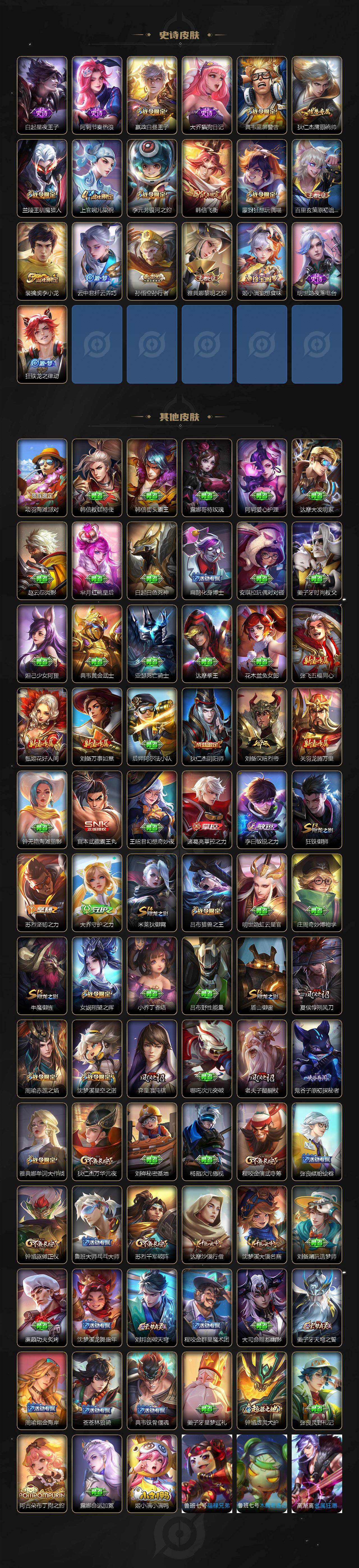 【史诗皮肤】:赵云皇家上将,狄仁杰魔术师,孙尚香水果甜心,妲己魅力维加斯,妲己女仆咖啡,墨子龙骑士,吕布圣诞狂欢,李白千年之狐,吕布末日机甲,刘邦德古拉伯爵,亚瑟心灵战警,百里守约特工魅影,白起星夜王子,阿轲节奏热浪,嬴政白昼王子,大乔猫狗日记,典韦蓝屏警告,狄仁杰鹰眼统帅,兰陵王驯魔猎人,上官婉儿梁祝,李元芳银河之约,韩信飞衡,蒙犽狂想玩偶喵,百里玄策原初追逐者,裴擒虎李小龙,云中君纤云弄巧,孙悟空孙行者,雅典娜黎明之约,姬小满妄想食味,明世隐夜落电台,狂铁龙之律动