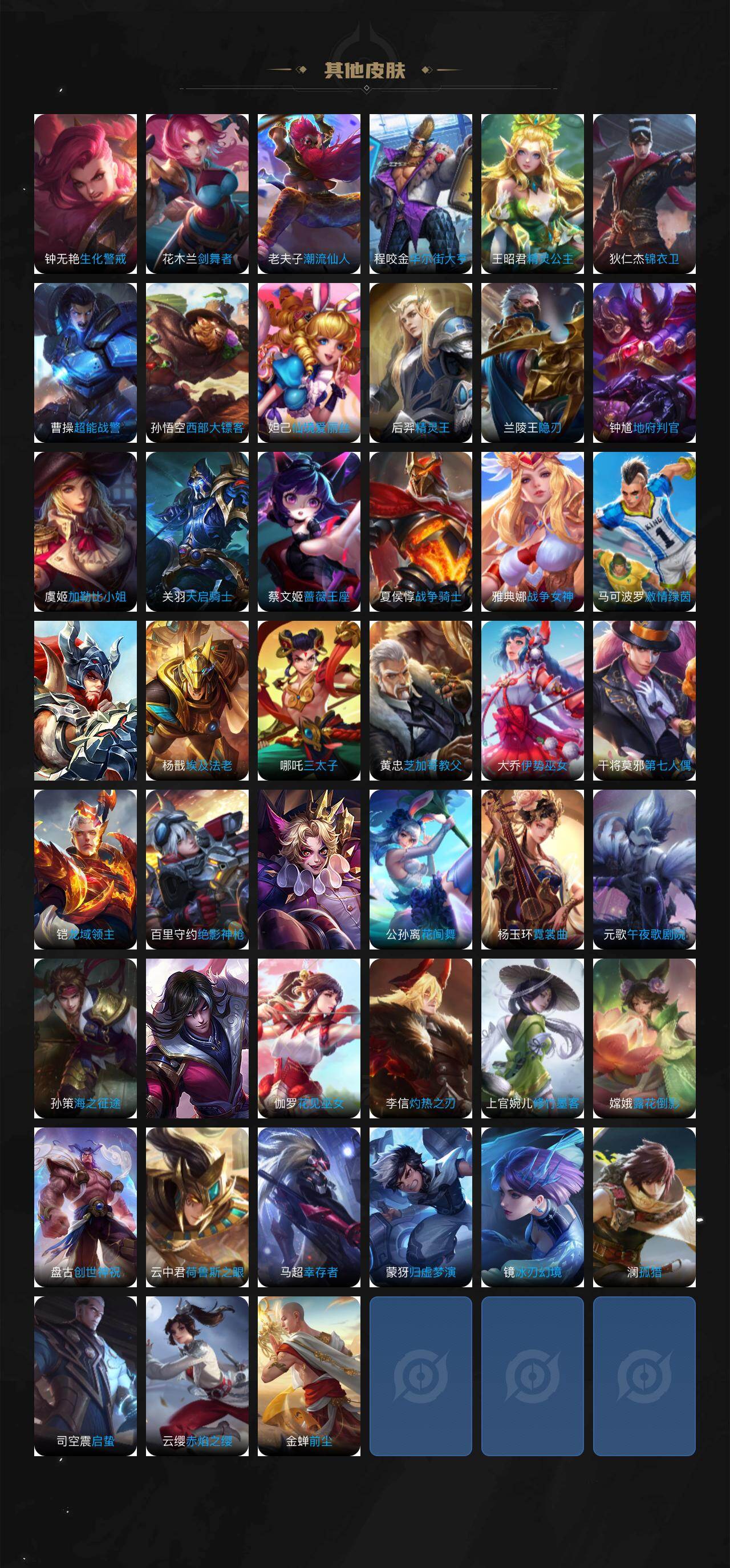 【其他皮肤】:项羽海滩派对,韩信教廷特使,韩信街头霸王,露娜哥特玫瑰,阿轲爱心护理,达摩大发明家,赵云忍炎影,芈月红桃皇后,白起白色死神,扁鹊化身博士,安琪拉玩偶对对碰,姜子牙时尚教父,妲己少女阿狸,典韦黄金武士,亚瑟死亡骑士,达摩拳王,花木兰兔女郎,张飞五福同心,甄姬花好人间,刘备万事如意,后羿阿尔法小队,狄仁杰阴阳师,刘备汉昭烈帝,关羽龙腾万里,钟无艳海滩