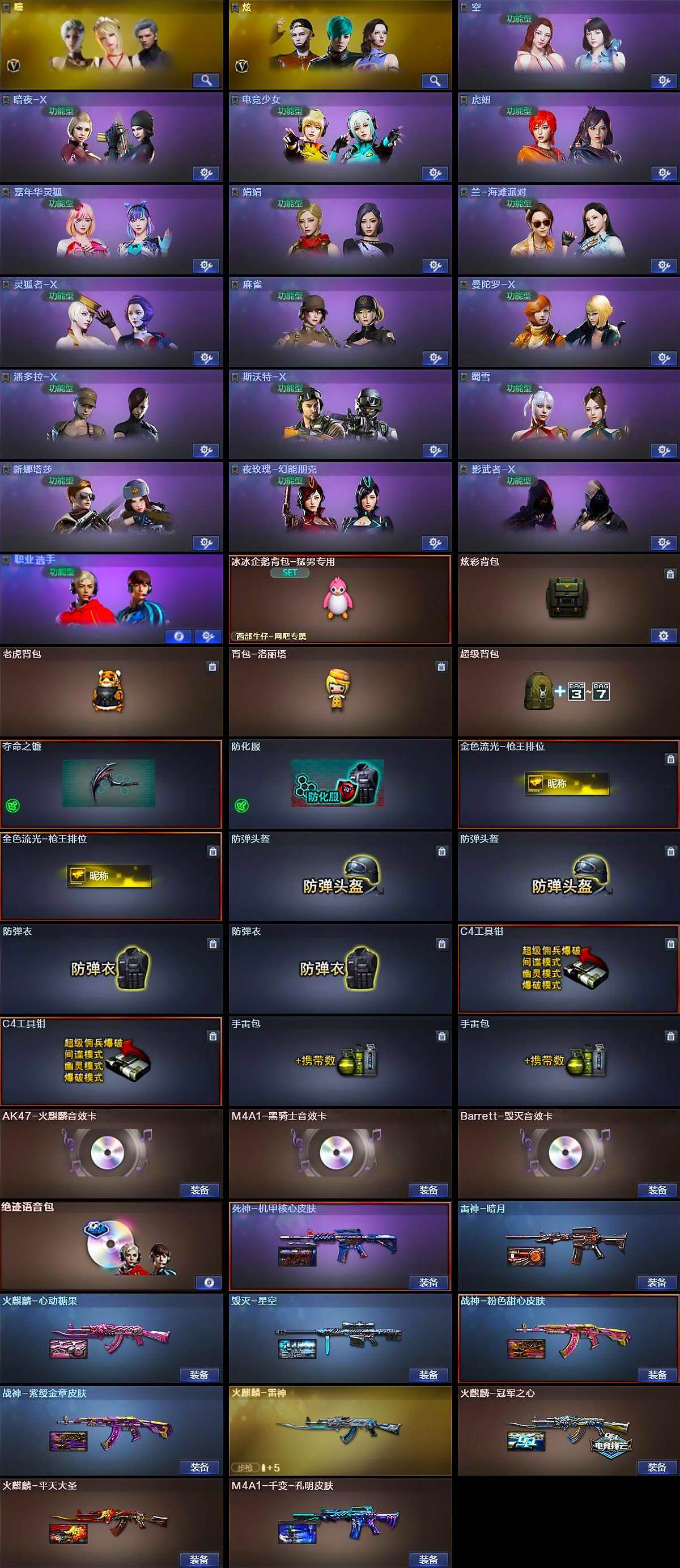 【道具】:冰冰企鹅背包-猛男专用,炫彩背包,老虎背包,背包-洛丽塔,超级背包,夺命之镰,防化服,金色流光-枪王排位*2,防弹头盔*2,防弹衣*2,C4工具钳*2,手雷包*2