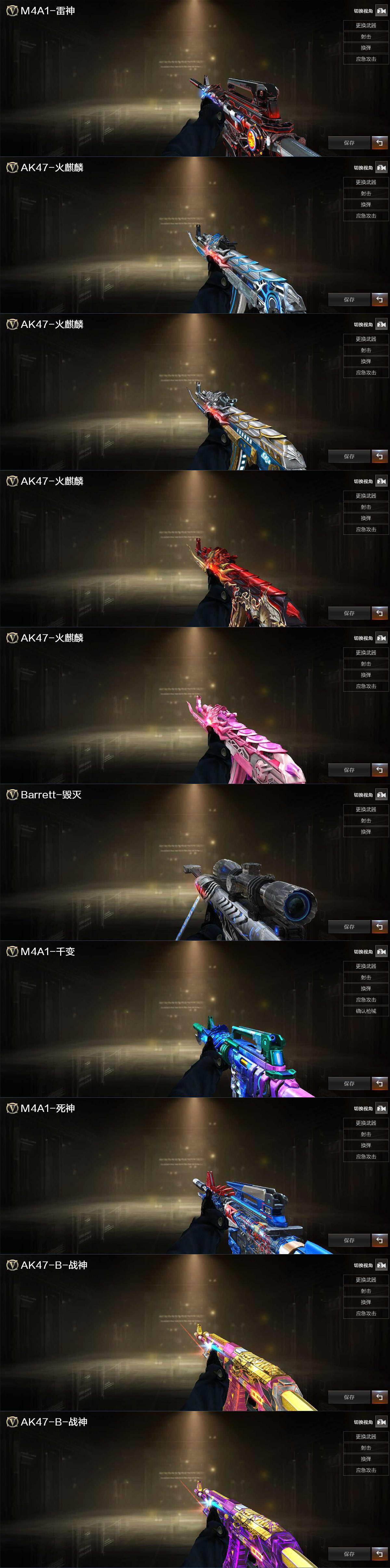 【皮肤】:雷神-暗月,火麒麟-雷神,火麒麟-冠军之心,火麒麟-平天大圣,火麒麟-心动糖果,毁灭-星空,M4A1-千变-孔明皮肤,死神-机甲核心皮肤,战神-粉色甜心皮肤,战神-紫绶金章皮肤