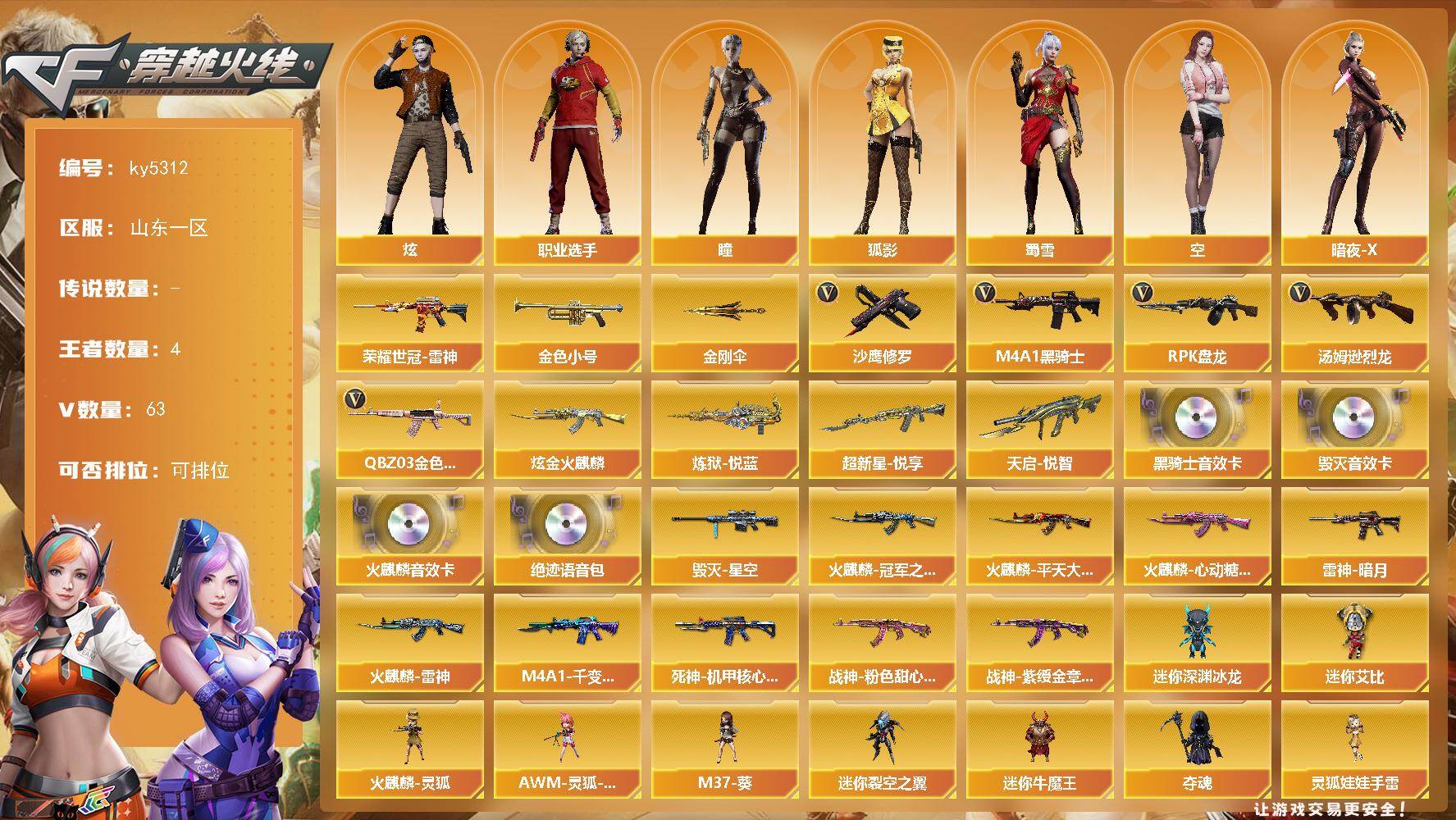 [16242182]山东一区-64V-4王者武器数-1炫金武器数 【热门武器】:QBZ03-金色蔷薇*3,荣耀世冠-雷神,金色小号,M4A1-黑骑士,汤姆逊-烈龙*3,RPK-盘龙,沙鹰-修罗,金刚伞 【王者炫金武器】:超新星-悦享,天启-悦智,炼狱-悦蓝,炫金火麒麟 【音效卡】:AK47-火麒麟音效卡,M4A1-黑骑士音效卡,Barrett-毁灭音效卡,绝迹语音包 【皮肤】:雷神-暗月,火麒麟-雷神,火麒麟-冠军之心,火麒麟-平天大圣,火麒麟-心动糖果,毁灭-星空,M4A1-千变-孔明皮肤,死神-机甲核心皮肤,战神-粉色甜心皮肤,战神-紫绶金章皮肤 【角色】:瞳,炫,狐影,空,暗夜-X,电竞少女,虎妞,嘉年华灵狐,娟娟,兰-海滩派对,兰-新年限定,灵狐者-X,麻雀,曼陀罗-X,潘多拉-X,斯沃特-X,蜀雪,新娜塔莎,夜玫瑰-幻能朋克,影武者-X,职业选手 【人偶武器】:火麒麟-灵狐,AWM-灵狐-15周年嘉年华,M37-葵,迷你深渊冰龙,迷你裂空之翼*3,迷你牛魔王,夺魂,生化手雷-机甲核心,深渊终结者手雷,迷你艾比,灵狐娃娃手雷 【挑战大师】:AK47-冰龙粉碎者*2,冰龙粉碎者-白马银枪,激光毁灭者III-白马银枪*2,激光毁灭者III 【英雄级武器】:M4A1-千变,AK47-火麒麟*2,M4A1-雷神,M4A1-黑骑士,M4A1-死神,AK12-天启,AK47-机械迷城,M4A1-雷霆,无影-神兵利器,QBZ03-金色蔷薇*3,王者之翼-觉醒版,荣耀世冠-雷神,AWM-天龙,Barrett-毁灭*2,Barrett-金色蔷薇,RPK-盘龙,汤姆逊-烈龙*3,AA-12-雷霆,沙鹰-修罗,沙鹰-天神,COP-雷霆,屠龙*2,龙啸*2,麒麟刺-堕天神,擎天,麒麟刺*4,高爆手雷-雷霆*6,高爆手雷-堕天神,闪光弹-雷霆*6,闪光弹-堕天神,烟雾弹-雷霆*6,烟雾弹-堕天神,烟雾弹-幻灵 【道具】:冰冰企鹅背包-猛男专用,炫彩背包,老虎背包,背包-洛丽塔,超级背包,夺命之镰,防化服,金色流光-枪王排位*2,防弹头盔*2,防弹衣*2,C4工具钳*2,手雷包*2 【特殊枪械】:1黑骑士,3烈龙,1盘龙