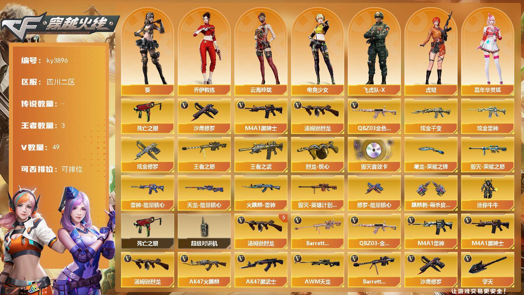 [16243807]四川二区-49V-3王者-4炫金 【热门武器】:QBZ03-金色蔷薇*2,死亡之眼*7,M4A1-黑骑士,汤姆逊-烈龙*5,沙鹰-修罗*5 【王者炫金武器】:王者之武,王者之怒,烈龙-悦心,炫金千变,炫金雷神*2,炫金修罗 【音效卡】:Barrett-毁灭音效卡 【皮肤】:雷神-能量核心,火麒麟-雷神,毁灭-荣耀之怒,毁灭-英雄计划 皮肤,天龙-能量核心,修罗-能量核心,屠龙-荣耀之锋,麒麟刺-萌杀皮肤 【角色】:葵,乔伊教练,云海玲珑,电竞少女,飞虎队-X,虎妞,嘉年华灵狐,娟娟,0号玩家,潘多拉-X,潘多拉-甜心教官,兔囡囡,影武者-X 【人偶武器】:迷你牛牛 【暴走生化】:死亡之眼*7,超级对讲机 【英雄级武器】:AK47-火麒麟,M4A1-雷神*4,M4A1-黑骑士,AK47-黑武士,AK47-机械迷城,AK47-黑鲨,无影-神兵利器,QBZ03-金色蔷薇*2,AK-47-猩红传说,AWM-天龙,Barrett-毁灭*3,AWM-裁决,Barrett-金色蔷薇,汤姆逊-烈龙*5,沙鹰-修罗*5,屠龙*7,擎天,麒麟刺*4,高爆手雷-雷霆,闪光弹-雷霆,烟雾弹-雷霆 【道具】:炫彩背包,超级背包,女皇终结者-魔龙之吻,救世主-黑桃战神,绿色巨人,灵魂忍者,迷雾幽灵,夺命之镰,防化服*2,金色流光-枪王排位,星辰流光-枪王排位,枪王排位28赛季金色流光,防弹头盔*3,防弹衣*4,C4工具钳*4,手雷包*3 【特殊枪械】:1黑骑士,5烈龙