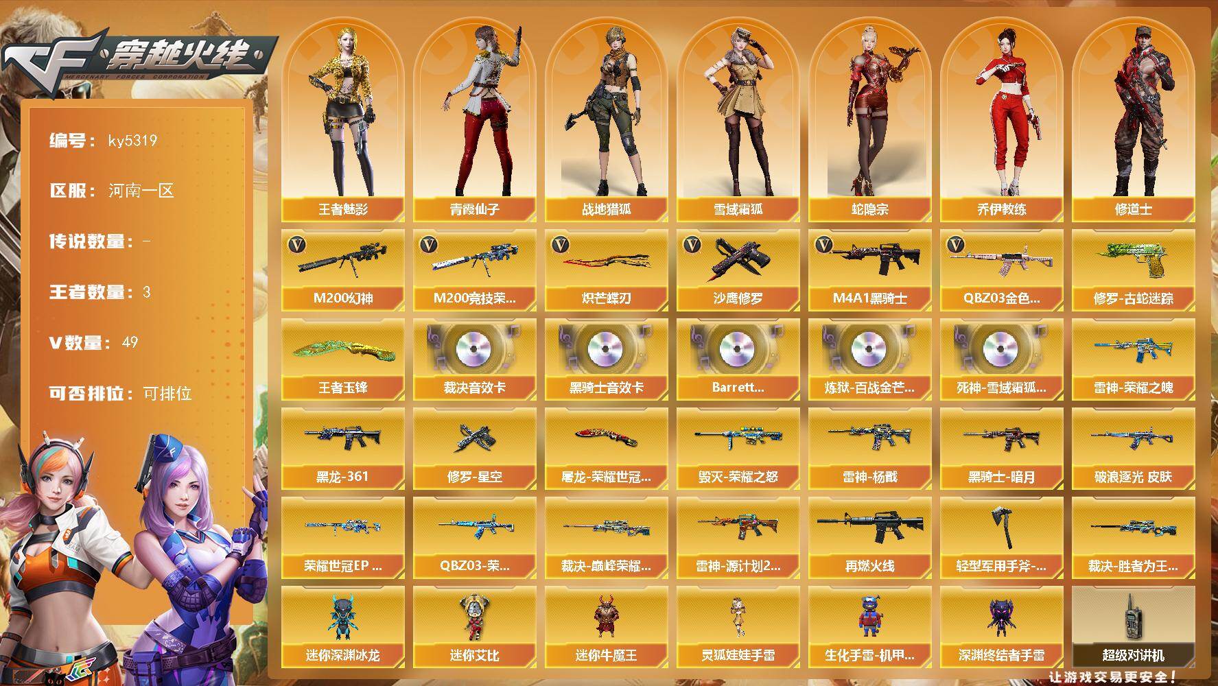 [16244369]河南一区-47V-3王者武器数-0炫金武器数 【热门武器】:QBZ03-金色蔷薇,M200-幻神,修罗-古蛇迷踪,M200-竞技荣光,M4A1-黑骑士,沙鹰-修罗,炽芒蝶刃 【王者炫金武器】:王者玉锋 【音效卡】:M4A1-黑骑士音效卡,AWM-裁决音效卡,Barrett-碧霄极光音效卡,炼狱-百战金芒-庆典舞曲音效卡,死神-雪域霜狐-怀旧音效卡 【皮肤】:幻神-荣耀世冠EP 皮肤,金色蔷薇-破浪逐光 皮肤,QBZ03-荣耀世冠EP 皮肤,裁决-巅峰荣耀 皮肤,裁决-胜者为王 皮肤,雷神-荣耀之魄,雷神-杨戬,雷神-源计划2.0专属 皮肤,M4A1-再燃火线,毁灭-荣耀之怒,M4A1-黑龙-361,黑骑士-暗月,修罗-星空,屠龙-荣耀世冠AG,轻型军用手斧-再燃火线 【角色】:妮妮,战地猎狐,王者-魅影,雪域霜狐,蛇隐宗,奇洋探员,乔伊教练,修道士,云海玲珑,暗夜-X,初恋灵狐,电竞少女,芳心审判者,兰-新年限定,0号玩家,灵狐者-X,灵狐者-黄金海岸,龙儿-小淘气,麻雀,潘多拉-X,潘多拉-甜心教官,潜龙队-X,邱刚敖,青霞仙子,蛇姬,斯沃特-X,兔囡囡,雪莉杨,影武者-X,游珑儿 【人偶武器】:迷你深渊冰龙,迷你牛魔王,生化手雷-机甲核心,深渊终结者手雷,迷你艾比,灵狐娃娃手雷 【暴走生化】:超级对讲机 【挑战大师】:激光毁灭者III*2,神圣爆裂者-末日III 【英雄级武器】:M4A1-雷神*2,M4A1-黑骑士,黑武士-锦绣游龙,QBZ03-金色蔷薇,黑骑士-海王*2,王者白虎-觉醒版,Barrett-毁灭,AWM-裁决,M200-幻神,M200-竞技荣光,炼狱-百战金芒,沙鹰-修罗,柯尔特-电竞之星,USP-冥王,修罗-古蛇迷踪,屠龙,擎天,炽芒蝶刃,麒麟刺-百战金芒,王者冰锋-觉醒版,高爆手雷-竞技荣光,高爆手雷-古蛇迷踪,高爆手雷-玄豹*2,闪光弹-雷暴,闪光弹-竞技荣光*4,闪光弹-玄豹*2,烟雾弹-古蛇迷踪,烟雾弹-玄豹,烟雾弹-荣耀世冠EP*5,M4A1-赤狱骑士,M4A1-苍鸣雷神,AWM-昌龙,Barrett-碧霄极光 【道具】:BS战队炫彩背包,CFS限定背包,EP战队炫彩背包,云山科技背包,亚洲杯纪念炫彩背包,古蛇迷踪炫彩背包,百战金芒炫彩背包,老虎背包,背包-洛丽塔,超级背包,雪域霜狐炫彩背包,哔哩哔哩名片,女皇终结者-魔龙之吻,救世