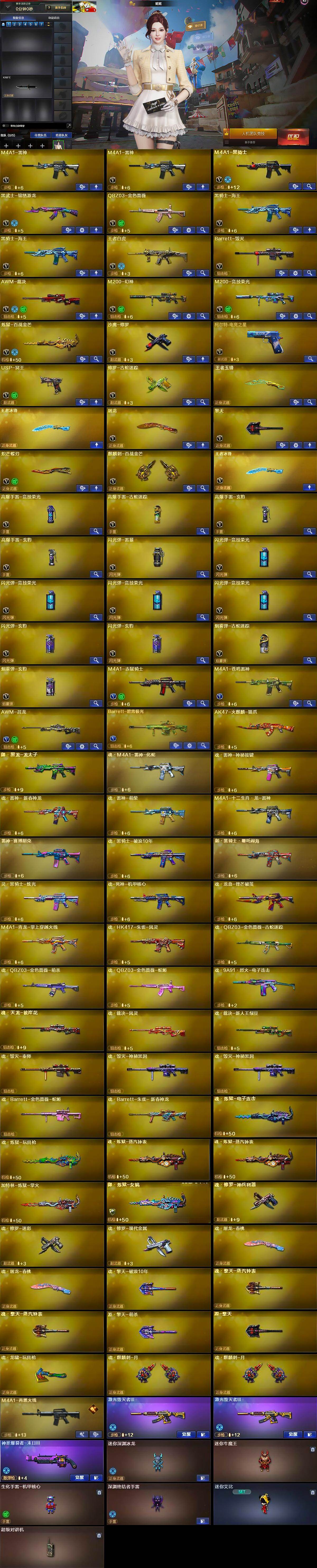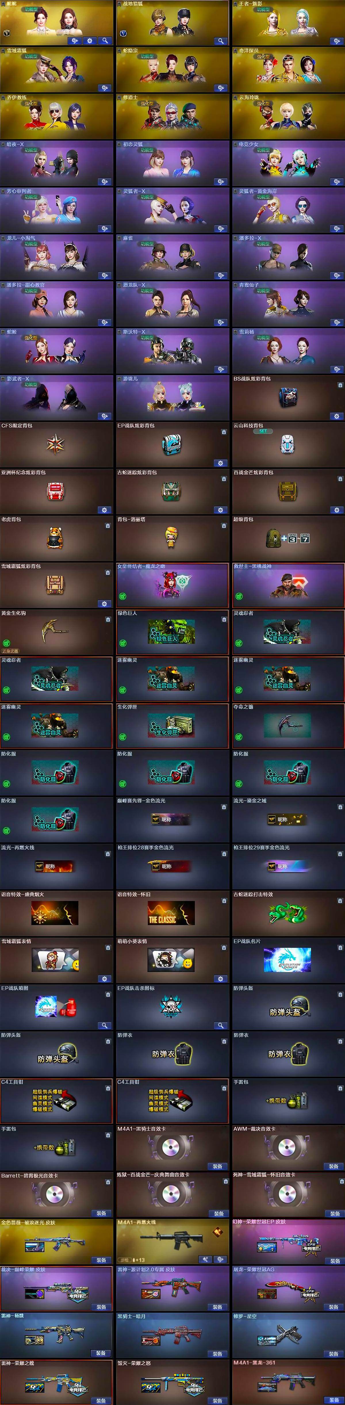 【英雄级武器】:M4A1-雷神*2,M4A1-黑骑士,黑武士-锦绣游龙,QBZ03-金色蔷薇,黑骑士-海王*2,王者白虎-觉醒版,Barrett-毁灭,AWM-裁决,M200-幻神,M200-竞技荣光,炼狱-百战金芒,沙鹰-修罗,柯尔特-电竞之星,USP-冥王,修罗-古蛇迷踪,屠龙,擎天,炽芒蝶刃,麒麟刺-百战金芒,王者冰锋-觉醒版,高爆手雷-竞技荣光,高爆手雷-古蛇迷踪,高爆手雷-玄豹*2,闪光弹-雷暴,闪光弹-竞技荣光*4,闪光弹-玄豹*2,烟雾弹-古蛇迷踪,烟雾弹-玄豹,烟雾弹-荣耀世冠EP*5,M4A1-赤狱骑士,M4A1-苍鸣雷神,AWM-昌龙,Barrett-碧霄极光