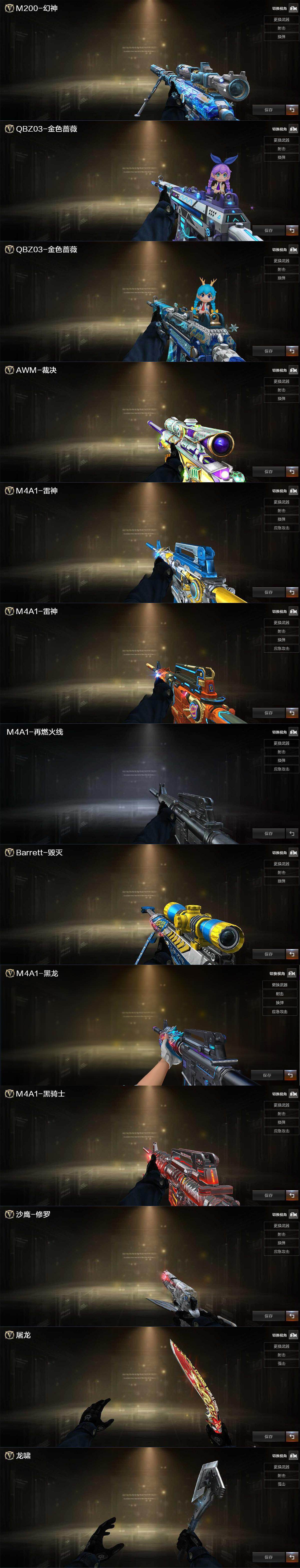 【热门武器】:QBZ03-金色蔷薇,M200-幻神,修罗-古蛇迷踪,M200-竞技荣光,M4A1-黑骑士,沙鹰-修罗,炽芒蝶刃
